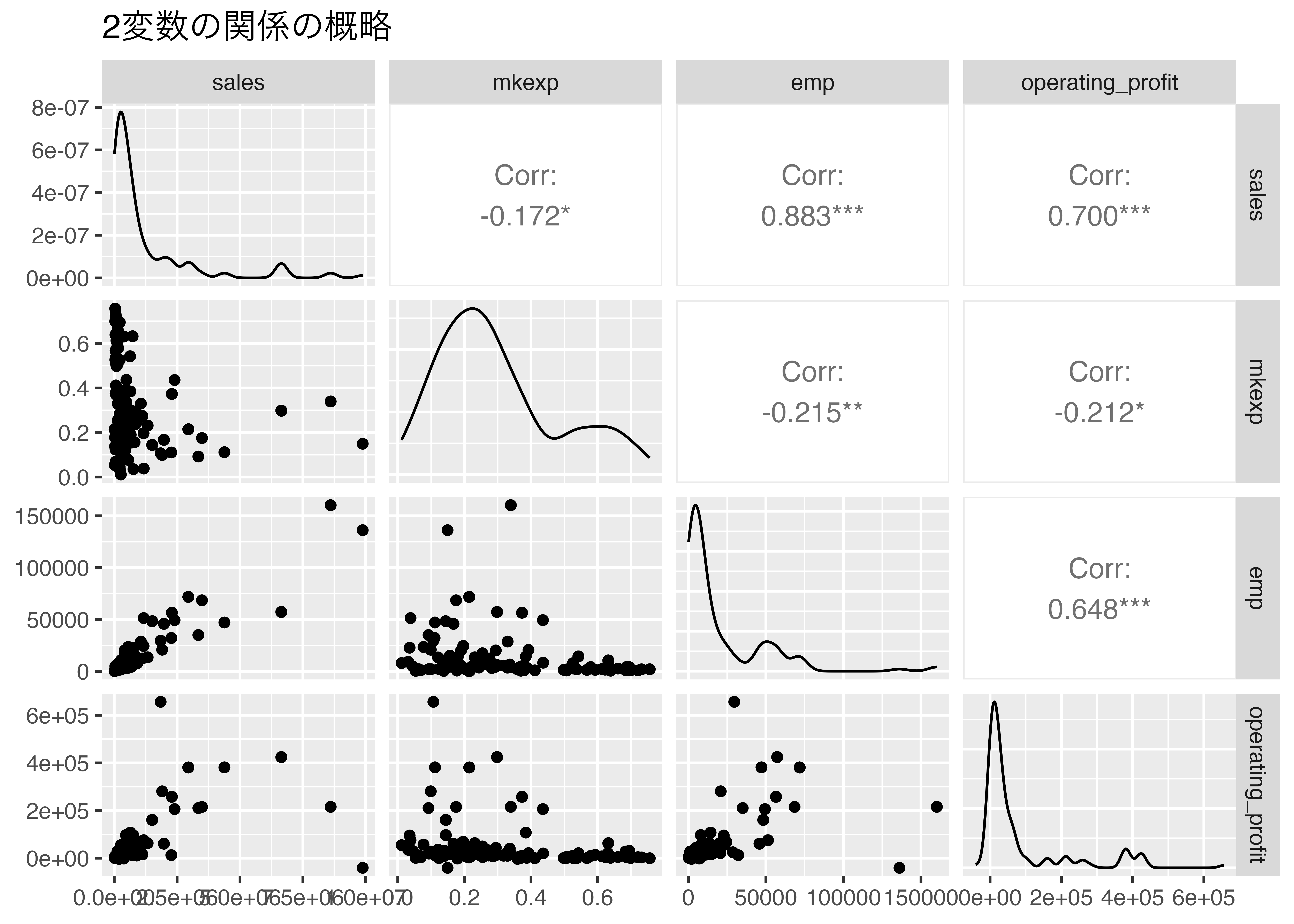 select(sales, mkexp, emp, operating_profit) |> # 変数を選択
