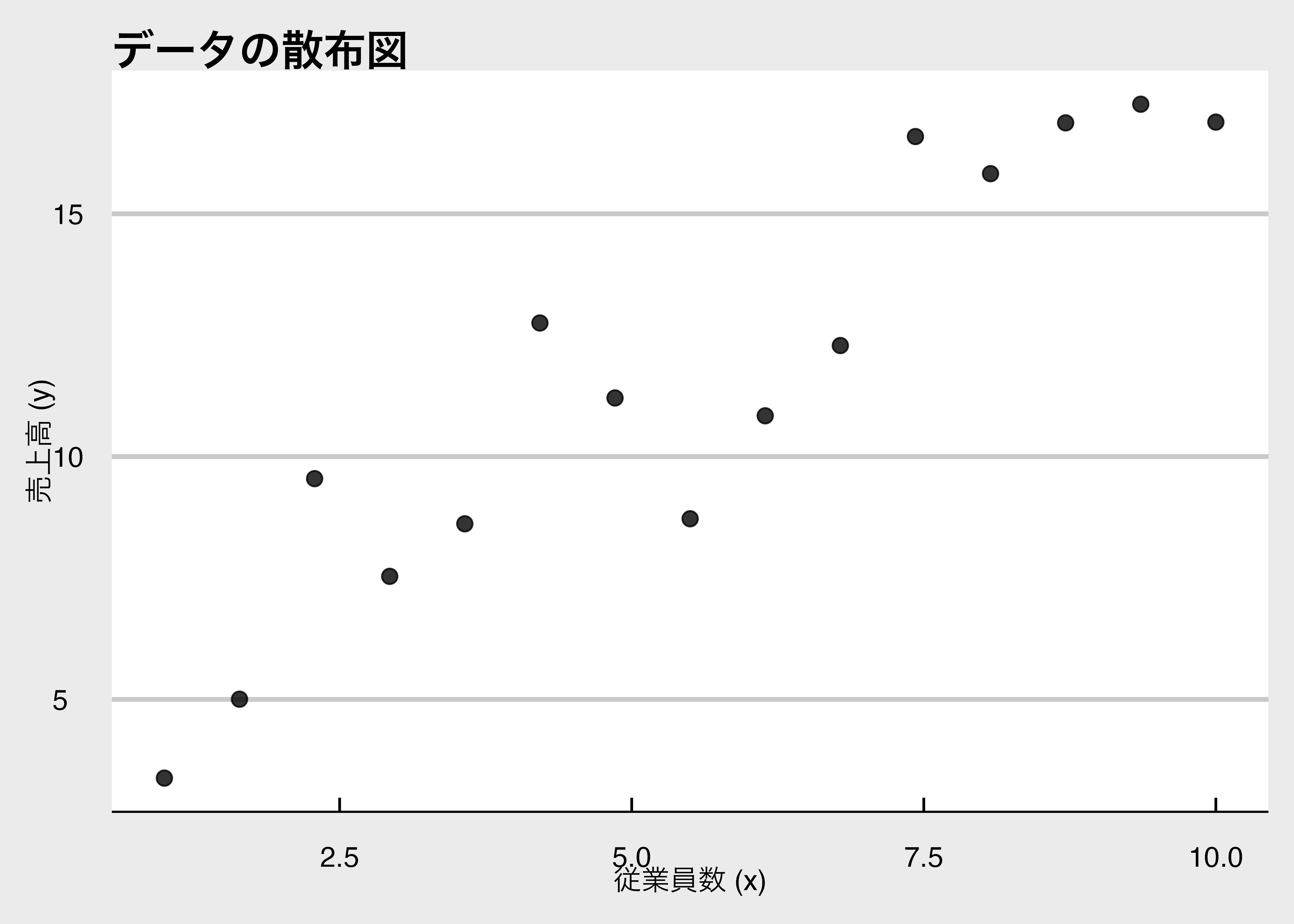 手元にある売上高yと従業員数xのデータを使って、横軸を従業員数、縦軸を売上高とした散布図に描くと次のようになります。