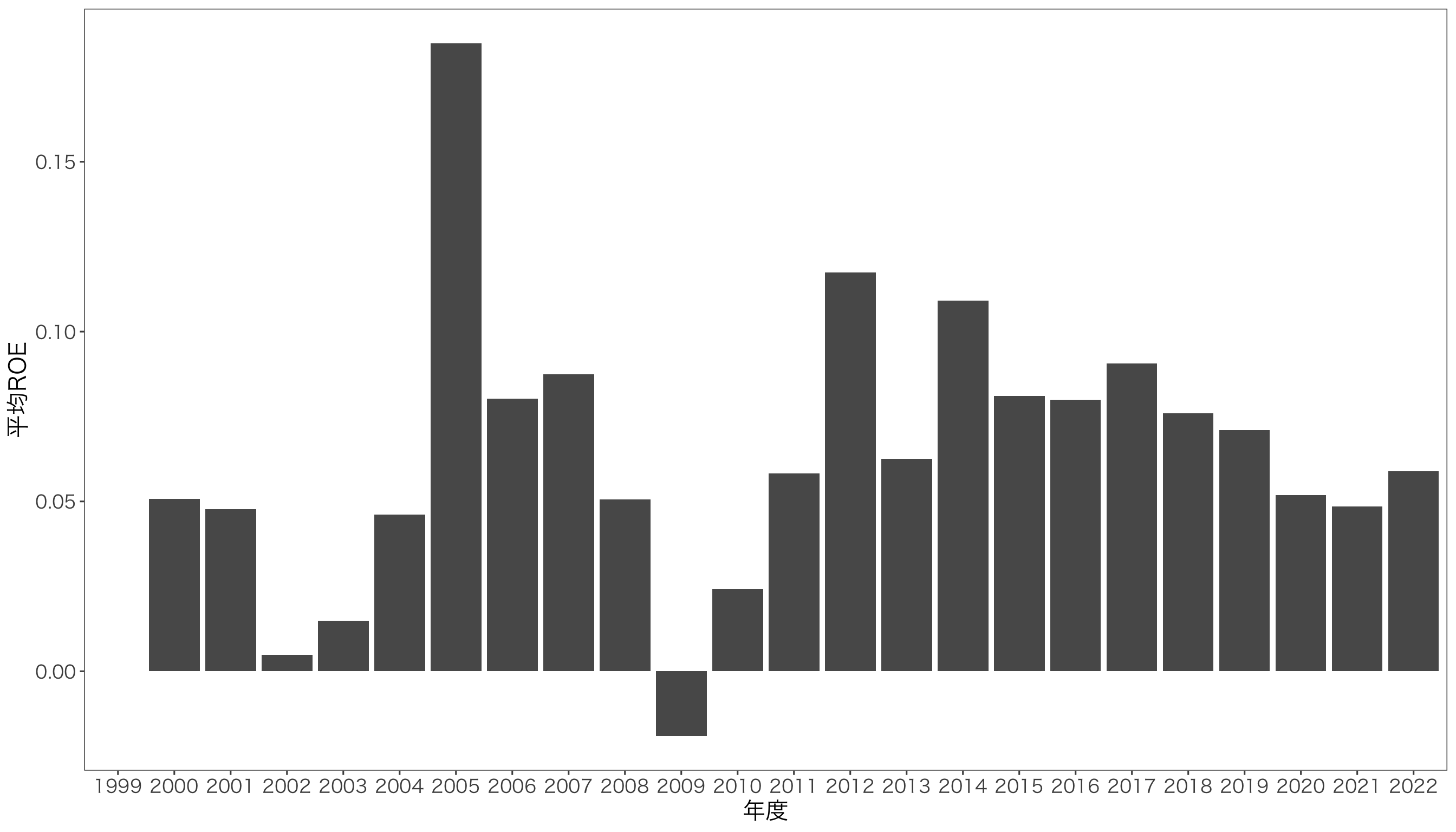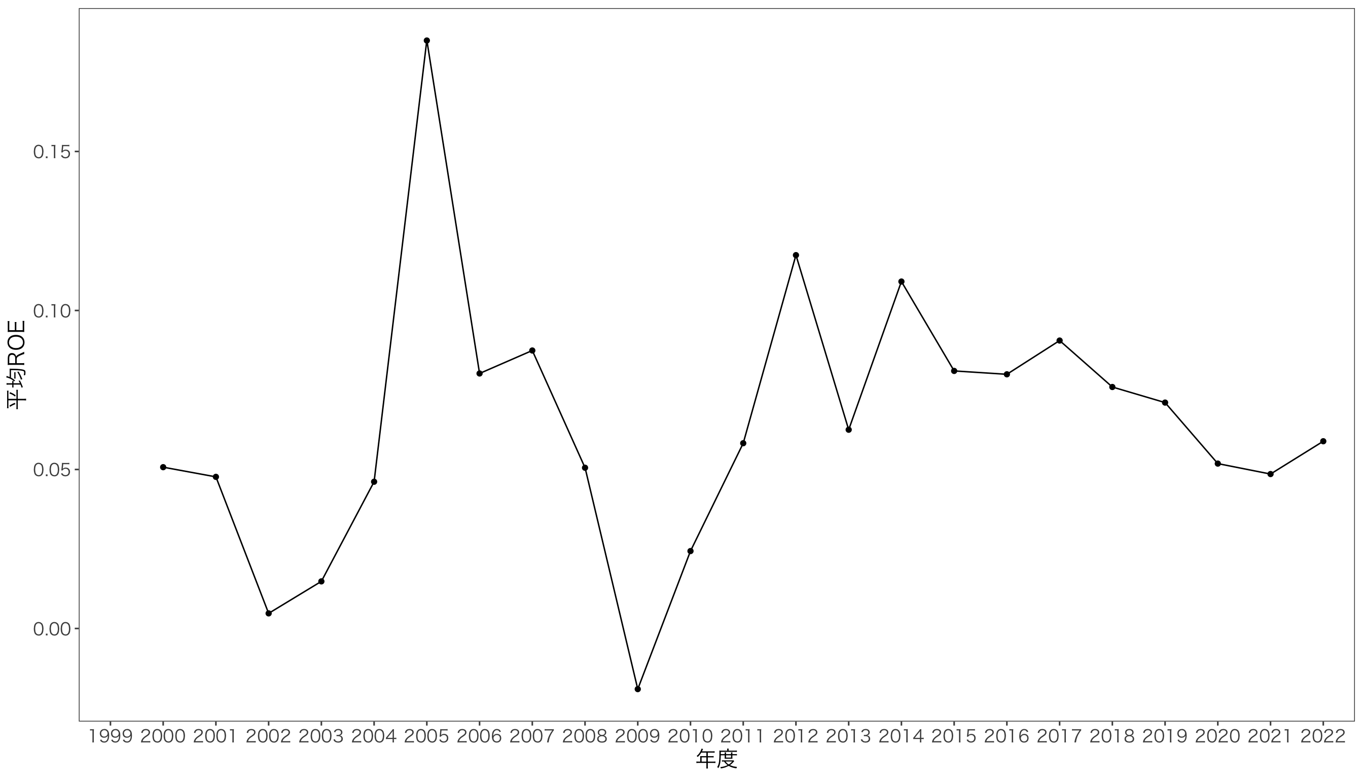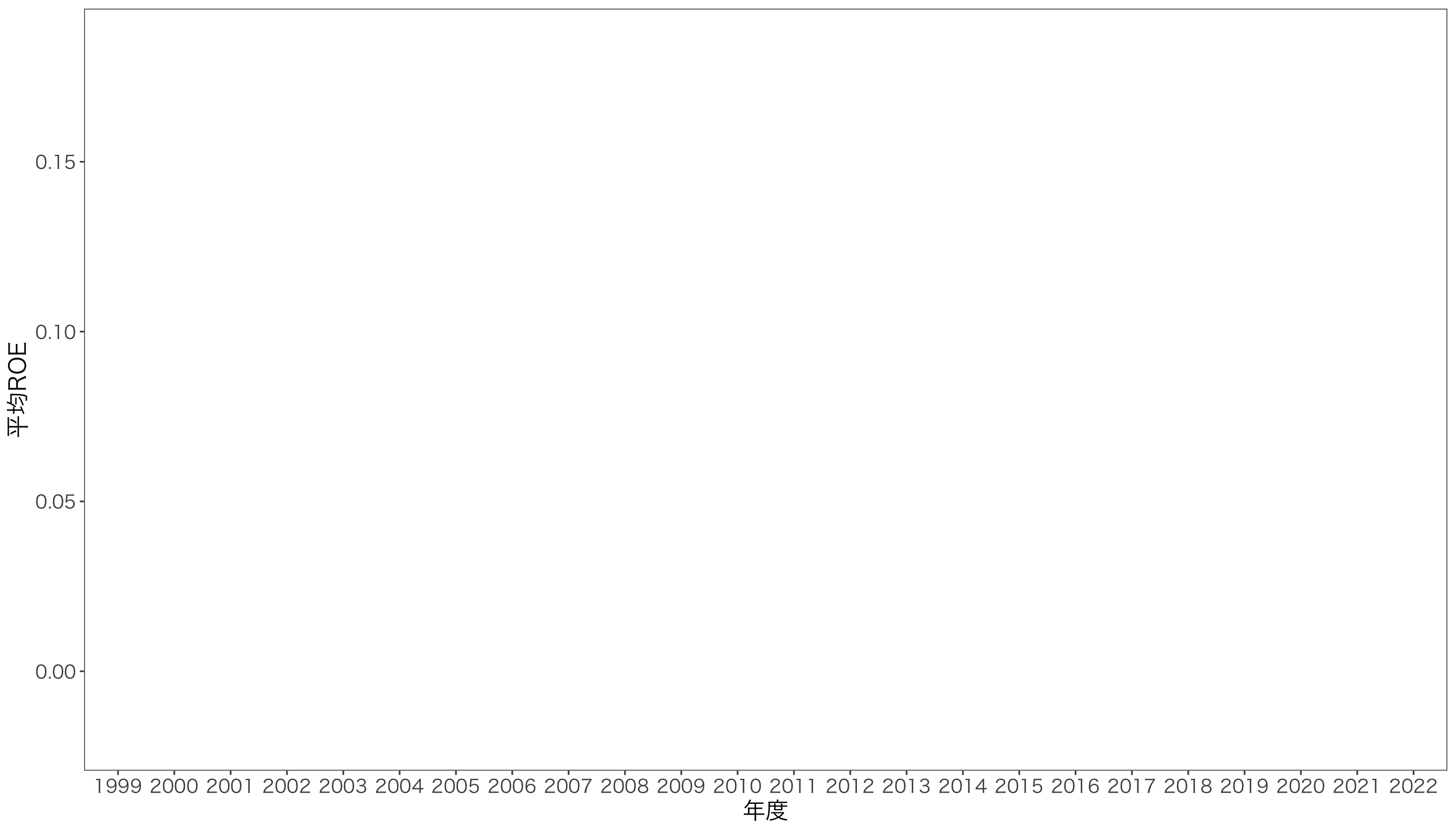g <- g + xlab("年度") + ylab("平均ROE") + mystyle # 見た目の調整