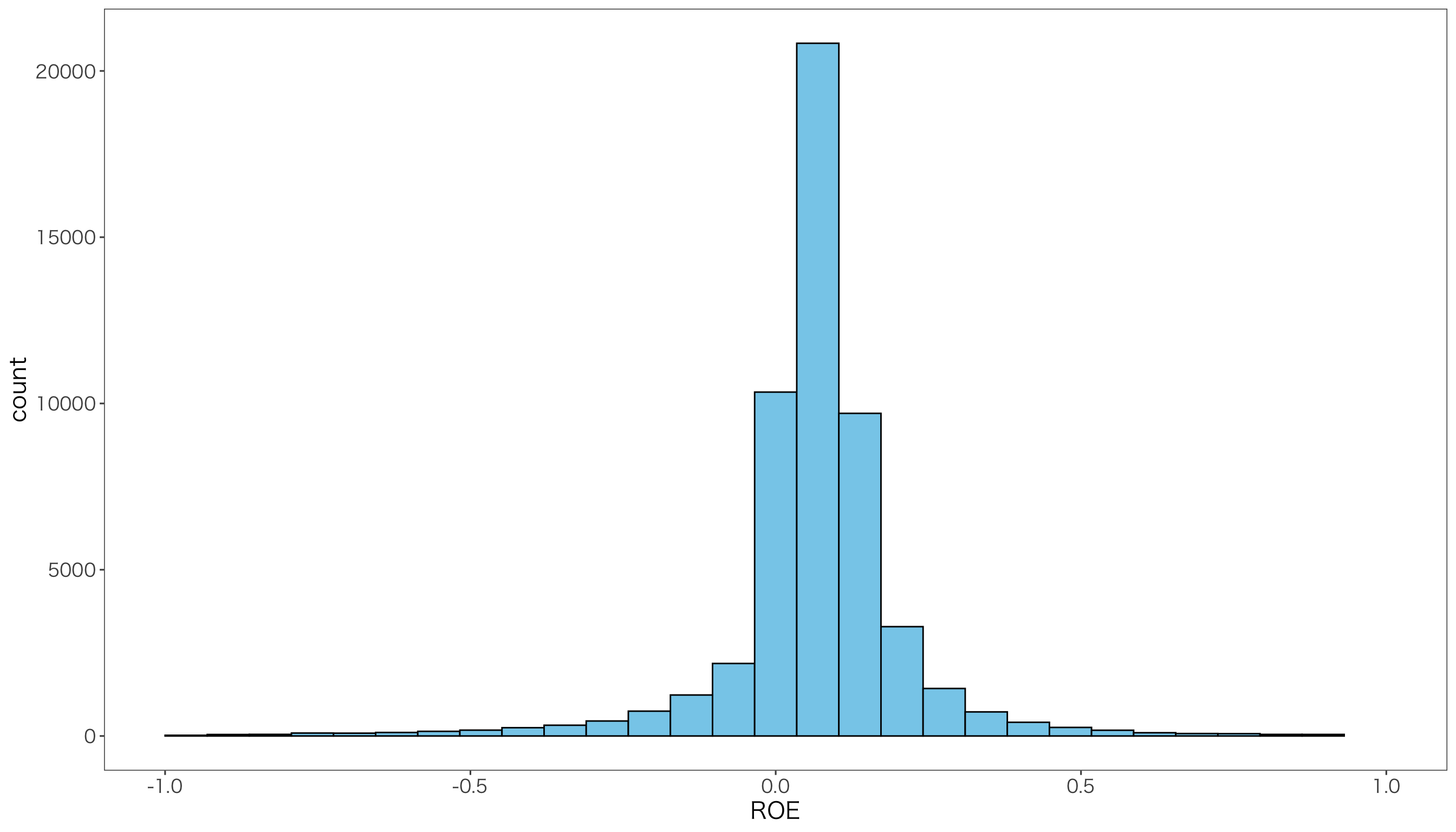 次に,前年度のROEのヒストグラムを作成してみましょう。