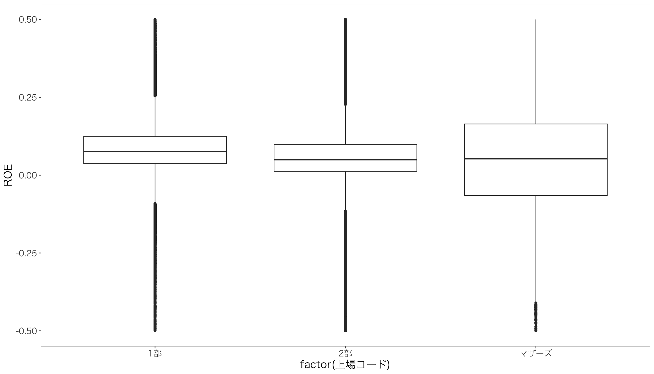 次に,上場場所別ROEの分布を箱ひげ図とバイオリンプロットで比較してみましょう。 箱ひげ図は,geom_boxplot()を使います。