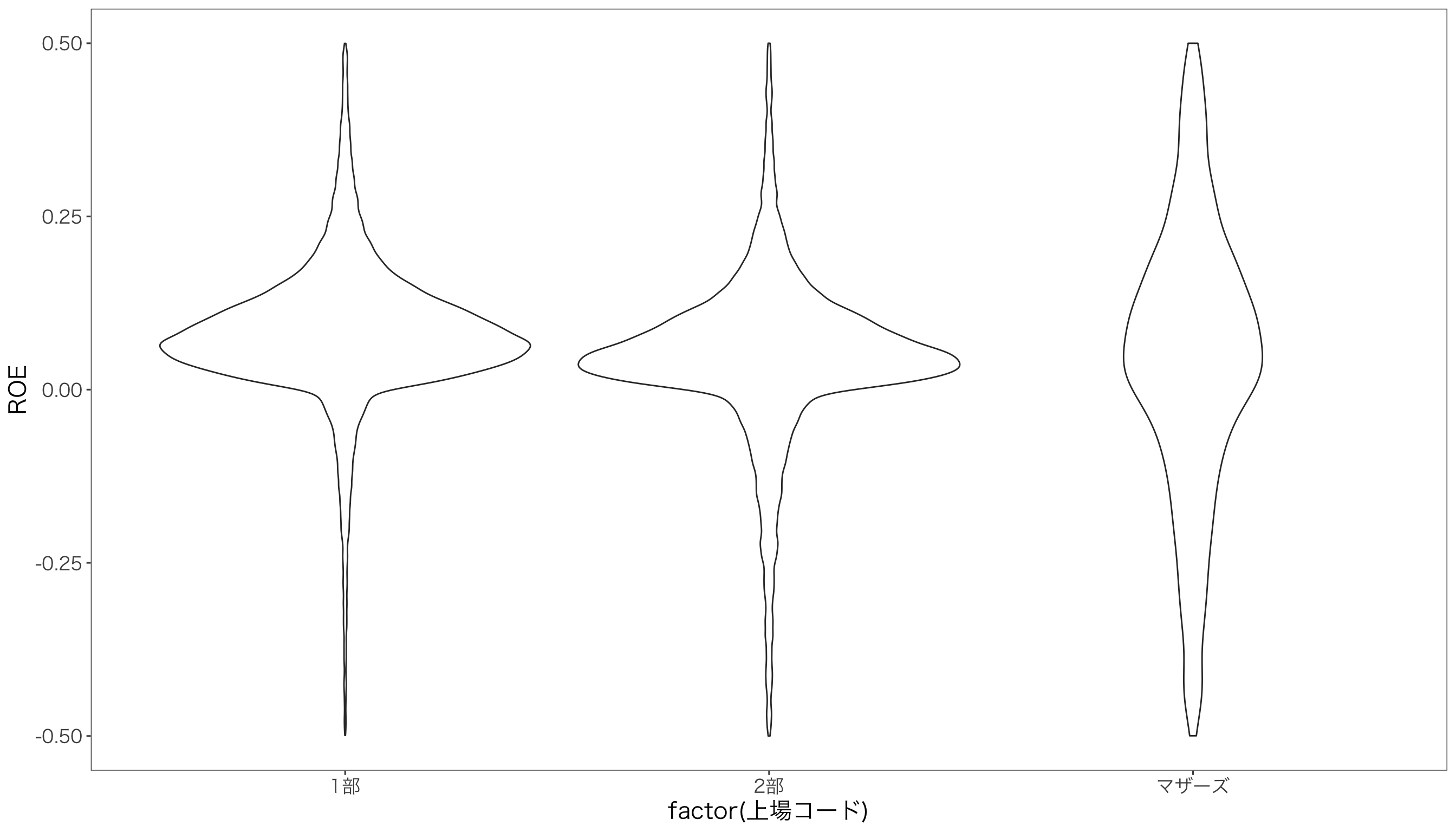 箱ひげ図やバイオリンプロットから,東証1部と東証2部の上場企業のROEは中央値に差があるものの,分布の形は似ていますが,マザーズの企業は,ROEの分布が大きく異なることがわかります。
