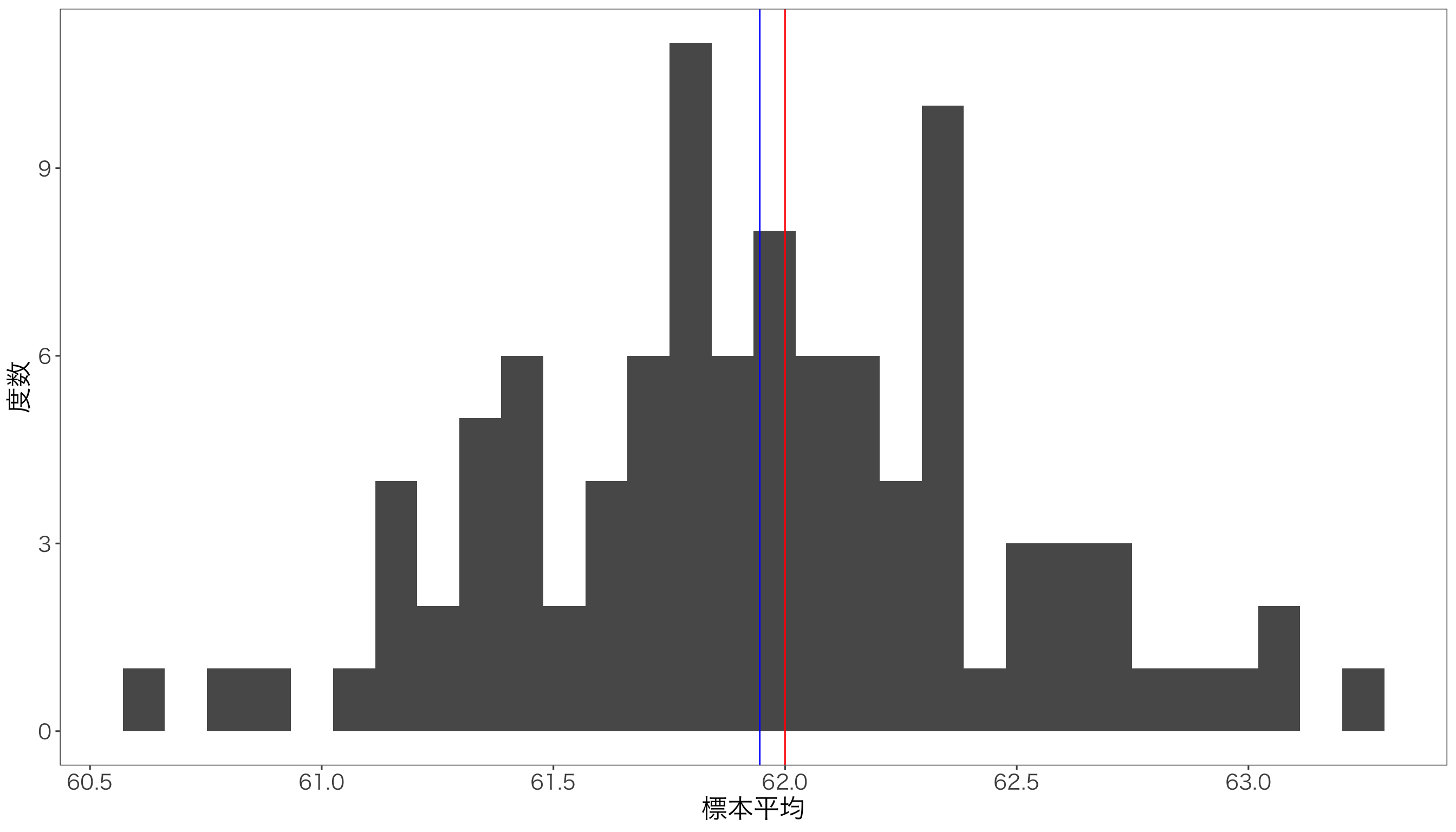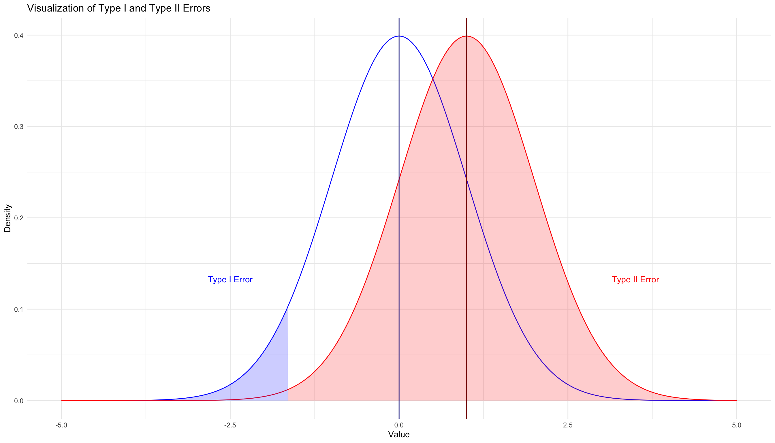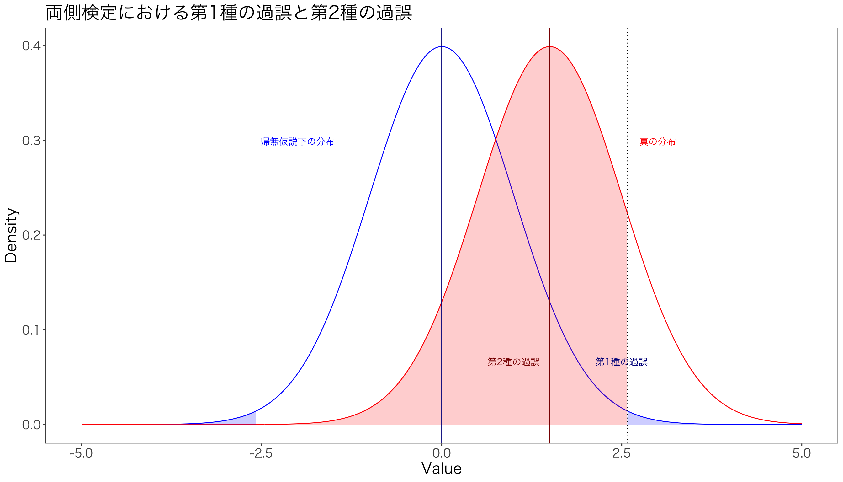 # 正規分布の確率密度関数dnorm_with_mean_sd <-function(x, mean =0, sd =1) {sqrt(1/(2*pi*sd^2))*exp(-((x - mean)^2)/(2*sd^2))}# パラメータの設定mu1 <-0# 帰無仮説の平均sd1 <-1# 帰無仮説の標準偏差mu2 <-1.5# 対立仮説の平均sd2 <-1# 対立仮説の標準偏差alpha =0.025# サンプルデータを生成x <-seq(-5, 5, by =0.01)df <-data.frame(x = x,dnorm1 =dnorm_with_mean_sd(x, mean = mu1, sd = sd1),dnorm2 =dnorm_with_mean_sd(x, mean = mu2, sd = sd2))# ggplotを使って描画g <-ggplot(df, aes(x = x)) +geom_line(aes(y = dnorm1), color ="blue") +geom_line(aes(y = dnorm2), color ="red")g <- g +geom_area(data =subset(df, x >qnorm(1-alpha, mu1, sd1)),aes(y = dnorm1), fill ="blue", alpha =0.2)g <- g +geom_area(data =subset(df, x <qnorm(alpha, mu1, sd1)),aes(y = dnorm1), fill ="blue", alpha =0.2)g <- g +geom_area(data =subset(df, x >qnorm(alpha, mu1, sd1) & x <qnorm(1-alpha, mu1, sd1)),aes(y = dnorm2), fill ="red", alpha =0.2) +theme_minimal() +labs(x ="Value", y ="Density",title ="両側検定における第1種の過誤と第2種の過誤")g <- g +geom_vline(xintercept =qnorm(1-alpha), linetype="dotted")g <- g +geom_vline(xintercept = mu1, color ="darkblue")g <- g +geom_vline(xintercept = mu2, color ="darkred")g <- g +annotate("text", x = mu1 +2.5, y =max(df$dnorm1) /6,label ="第1種の過誤", color ="darkblue", family ="HiraKakuProN-W3") +annotate("text", x = mu2 -0.5, y =max(df$dnorm2) /6,label ="第2種の過誤", color ="darkred", family ="HiraKakuProN-W3")g <- g +annotate("text", x = mu1 -2, y =max(df$dnorm1)-0.1,label ="帰無仮説下の分布", color ="blue", family ="HiraKakuProN-W3" ) +annotate("text", x = mu2 +1.5, y =max(df$dnorm2) -0.1,label ="真の分布", color ="red", family ="HiraKakuProN-W3") + mystyleprint(g)