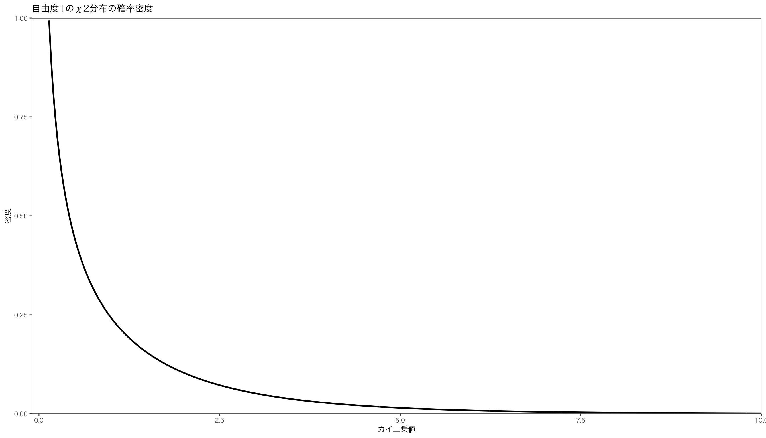 p <- p + ylim (c (0 ,1 )) + ylab ("密度" ) + xlab ("カイ二乗値" ) +