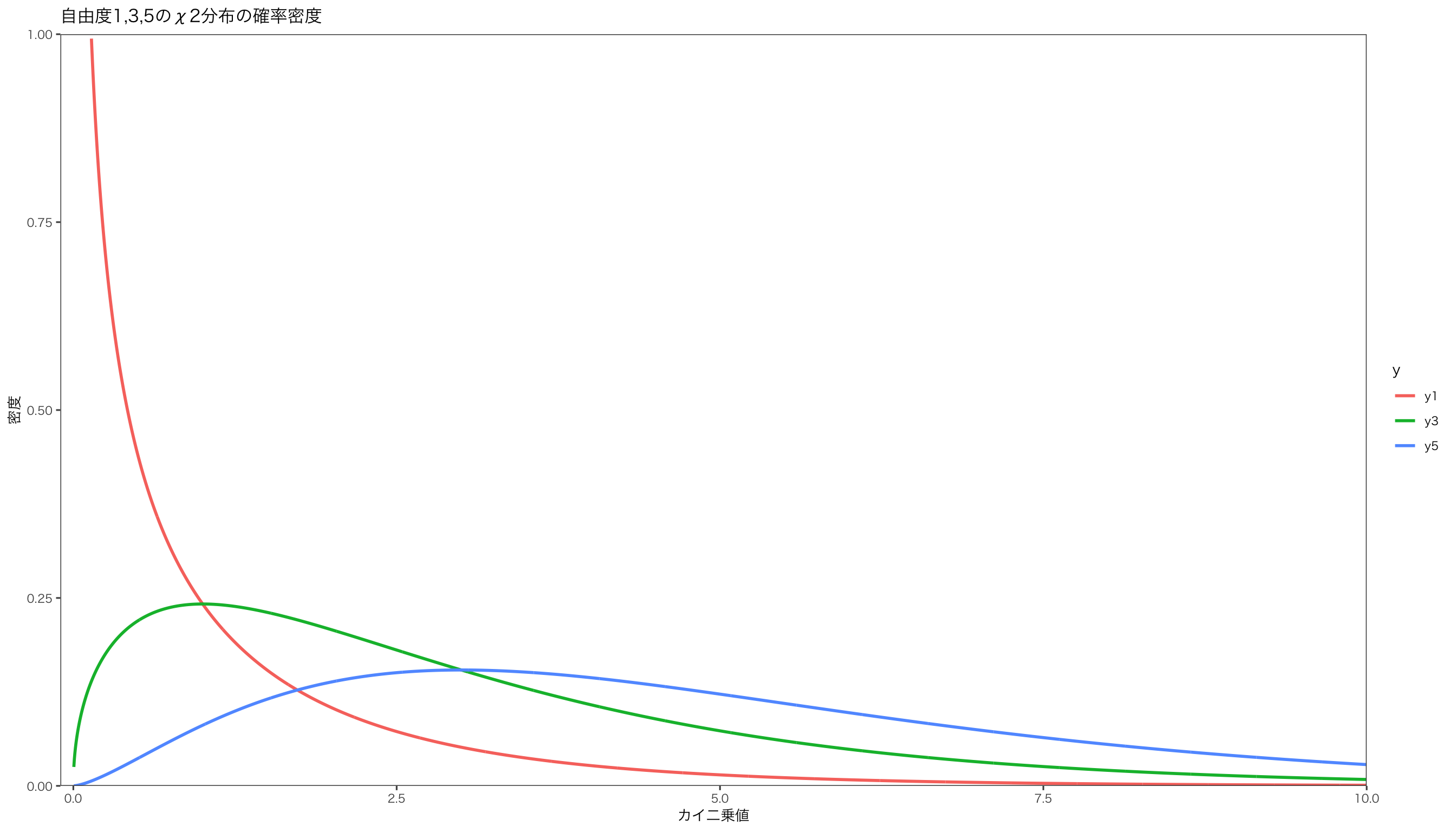 p <- p + ggtitle ("自由度1,3,5のχ2分布の確率密度" ) + mystyle