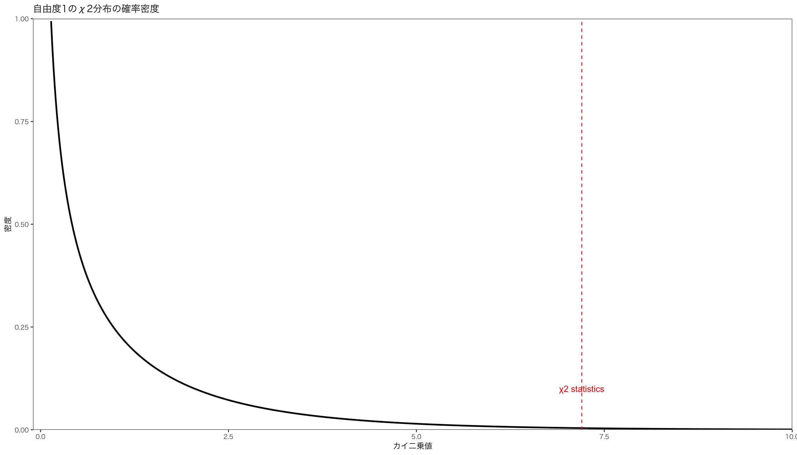 \chi^2 統計量がとなりました。 この\chi^2 統計量が自由度1の\chi^2 分布にしたがう場合,この統計量が得られる確率は次のようになります。