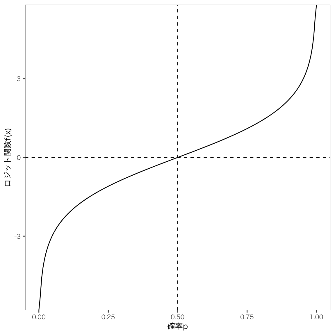 ロジット関数f(p)の逆関数をf^{-1}(x)とすると,f^{-1}(x)は-\inftyから\inftyの値をとるとき,pは0から1の値をとるようになります。 これからの分析に必要な関数の形がでてきました。 この関数f^{-1}(x)を標準ロジスティック関数と言います。