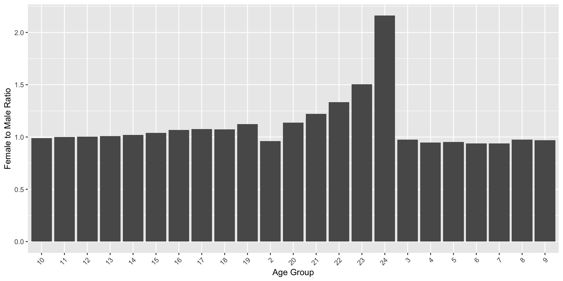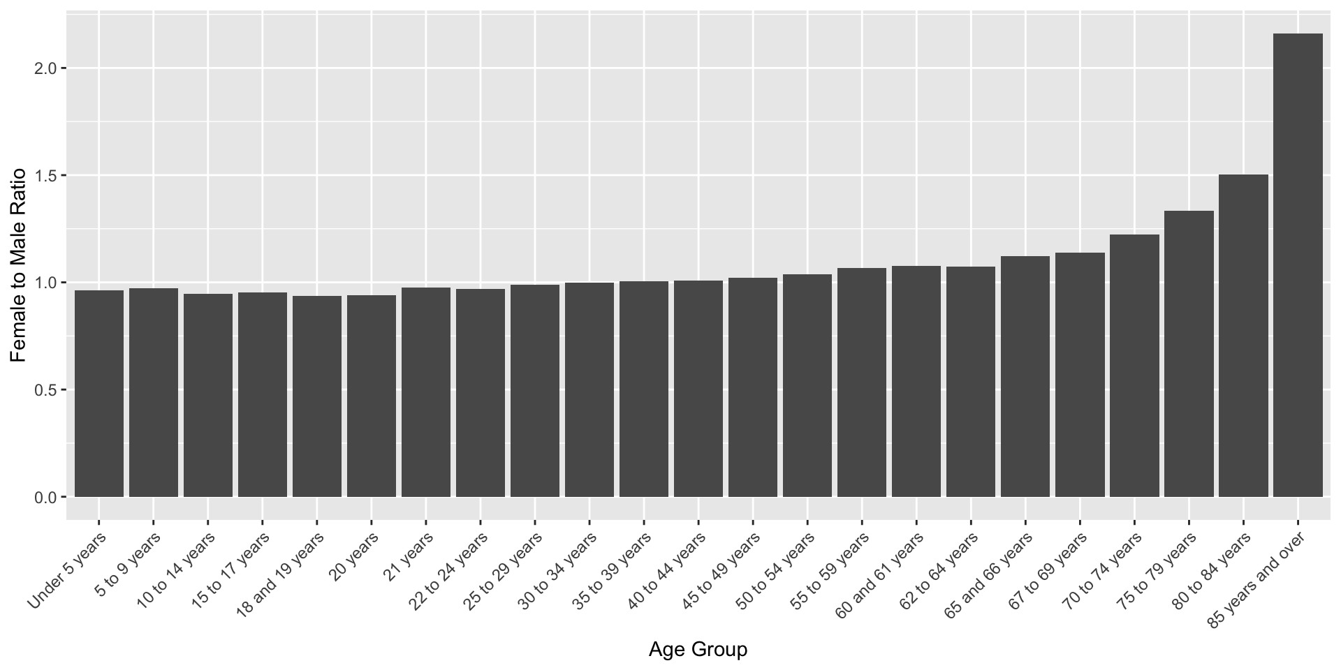 pacman::p_load(acs)# Set API keyapi.key.install("e6045d03ade2aa986ae443b6f9b21250df4b13fc")# Lookup table for age groupslook <-acs.lookup(endyear =2019, keyword =c("Female"))age_groups <- look@results[1:24, "label"]# Function to fetch ACS datafetch_data <-function(keyword, geo) { fet <-acs.fetch(endyear =2014, span =5, table.number ="B01001", keyword = keyword, geography = geo) fet_tbl <- fet@estimatecolnames(fet_tbl) <- age_groups fet_tbl <-as.data.frame(t(fet_tbl)) fet_tbl <- fet_tbl[-1, , drop =FALSE]colnames(fet_tbl) <-"population" fet_tbl$age_group <-rownames(fet_tbl) fet_tbl$population <-as.numeric(as.character(fet_tbl$population))return(fet_tbl)}# Geographic area (Illinois)geo <-geo.make(state ="IL")# Fetch female and male datafet_fem <-fetch_data("Female", geo)fet_male <-fetch_data("Male", geo)# Compute female to male ratiofet_ratio <- fet_fem %>%inner_join(fet_male, by ="age_group", suffix =c(".fem", ".male")) %>%mutate(fem_to_male = population.fem / population.male)# Plotggplot(fet_ratio, aes(x = age_group, y = fem_to_male)) +geom_col() +theme(axis.text.x =element_text(angle =45, hjust =1)) +xlab("Age Group") +ylab("Female to Male Ratio")