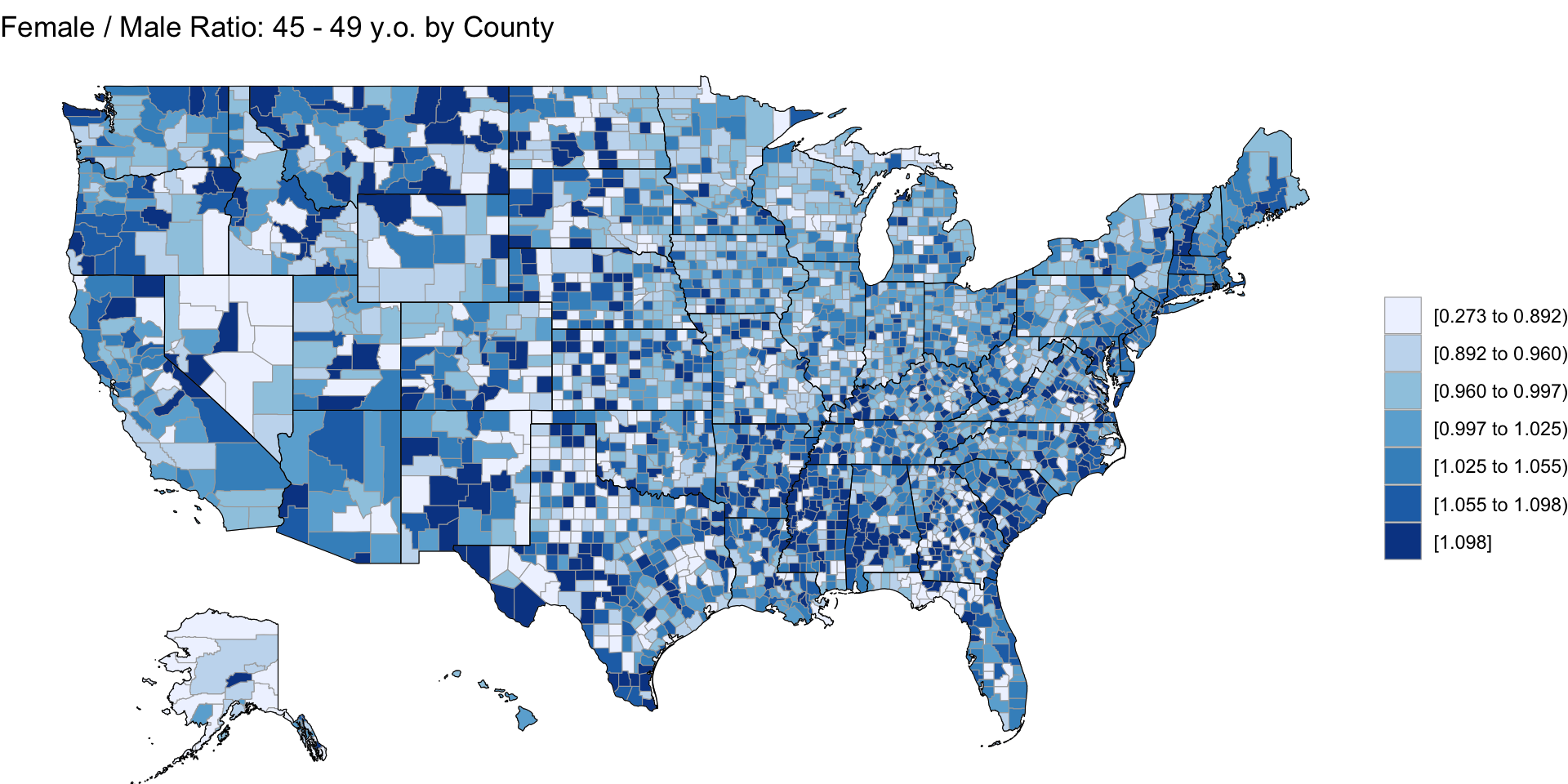 R45 <- M45 |> dplyr::inner_join(F45, by ="region")R45$value <- R45$value.y / R45$value.xcounty_choropleth(R45[,c(1,4)], title ="Female / Male Ratio: 45 - 49 y.o. by County")
