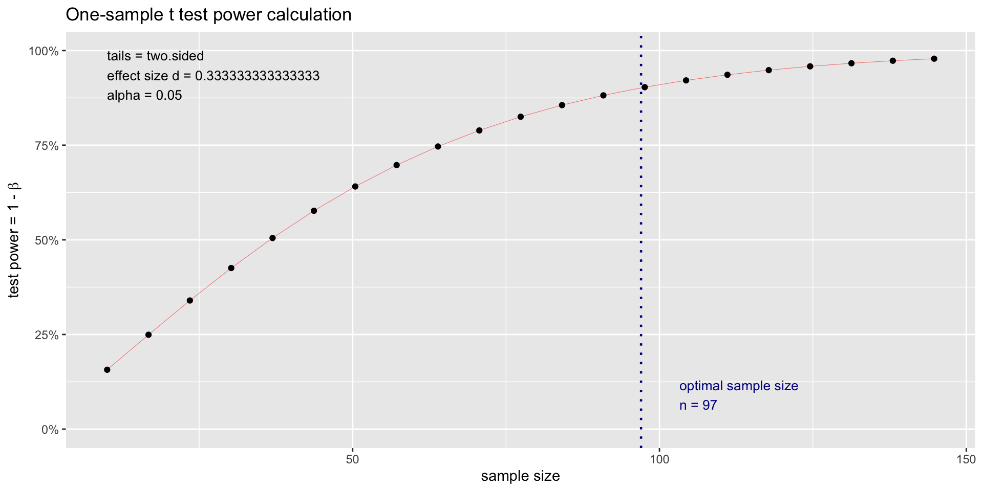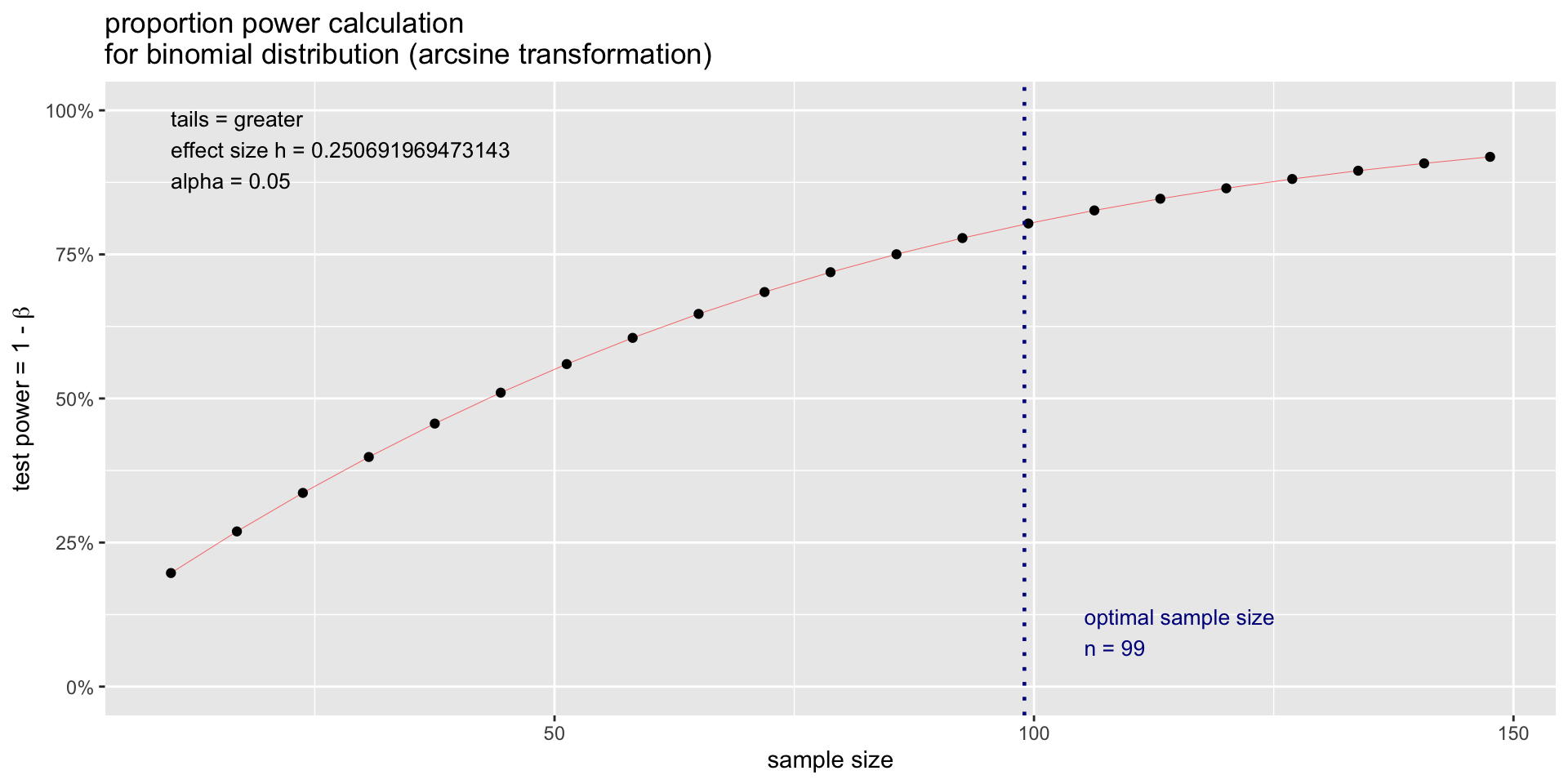 The sample sizes can be determined using Cohen’s power analysis (Cohen 1992) which is implemented in R’s pwr package.