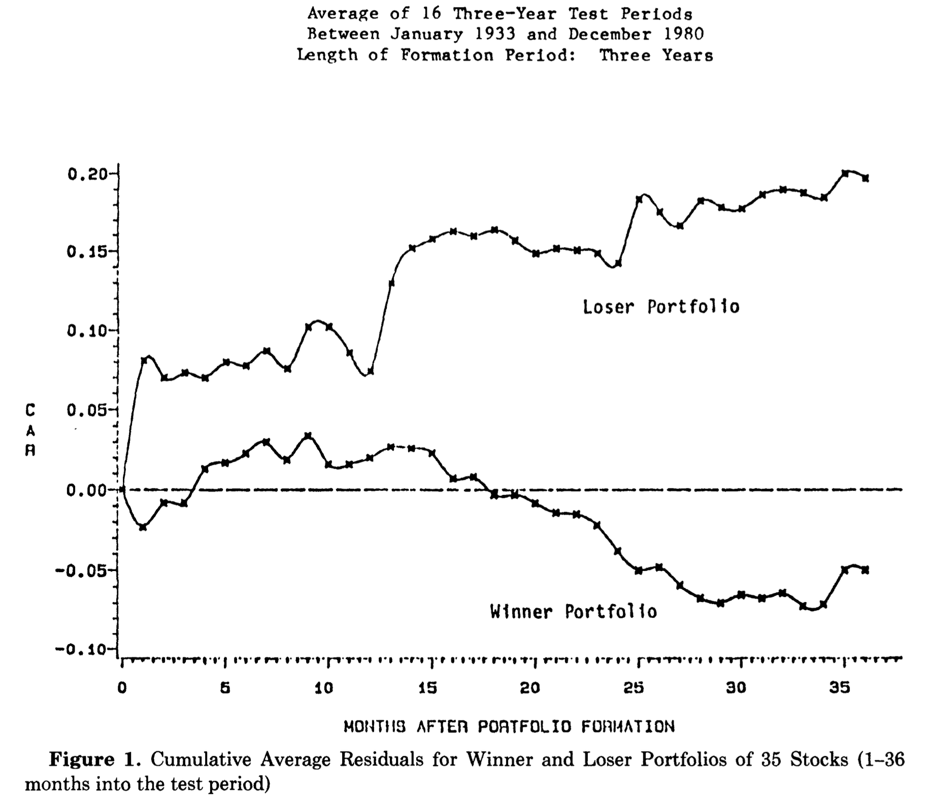ある時点において,過去3年間に遡って極端にリターンが低かった株式(敗者株)は,極端にリターンの高かった株式(勝者株)に比べて,その後3年間においてはるかに株価が好調である。