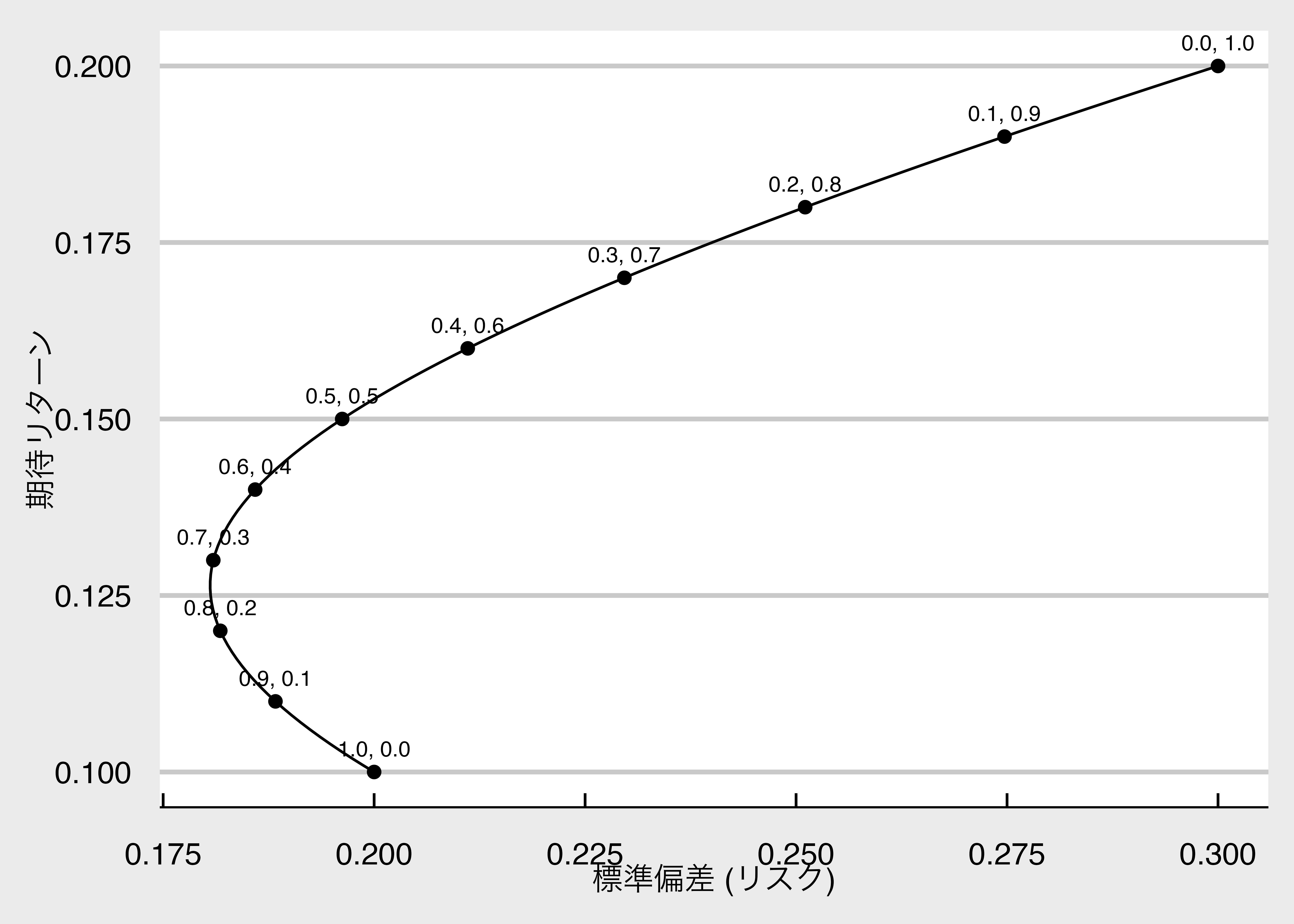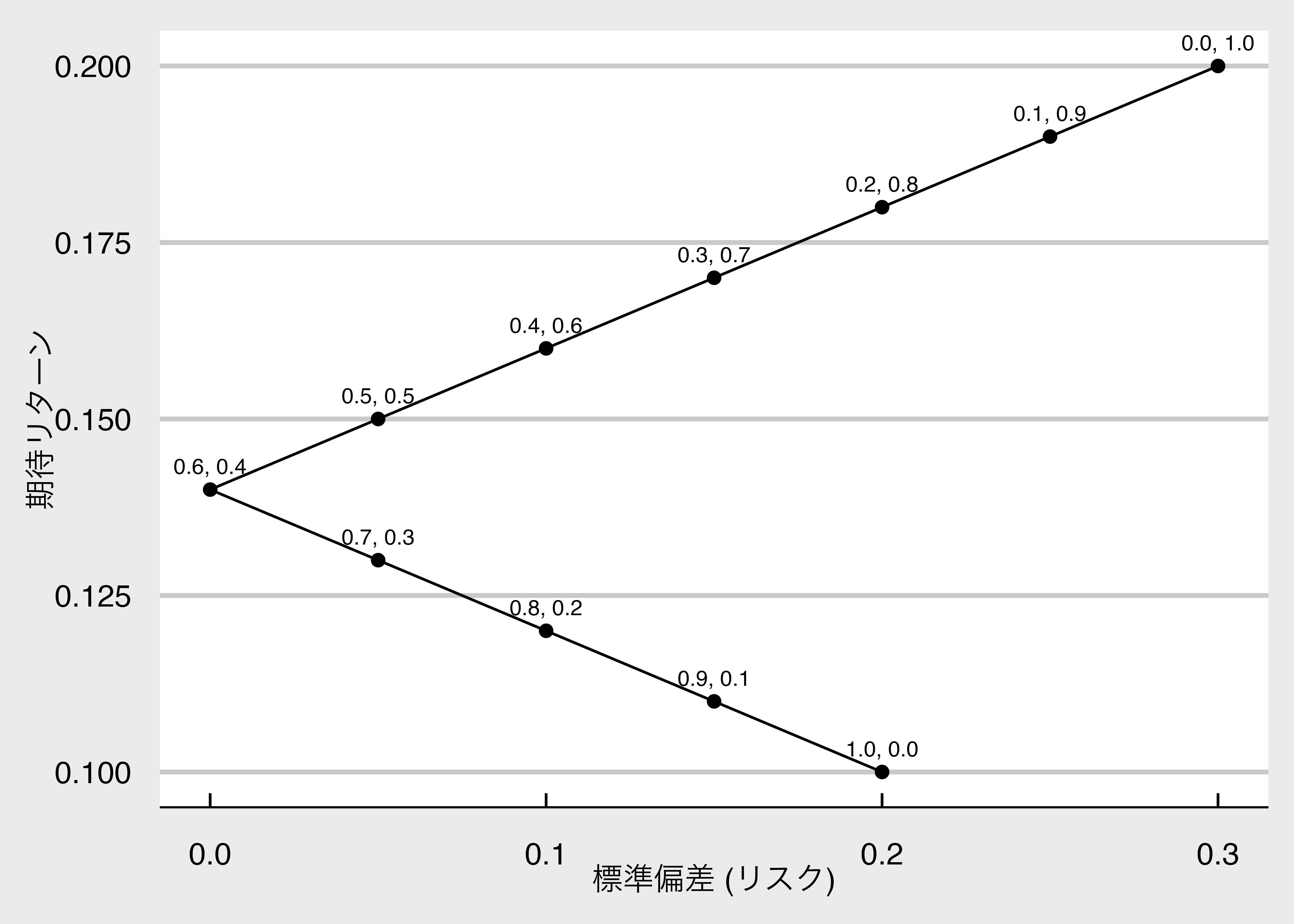 x = "リスク (標準偏差)", y = "期待リターン") +