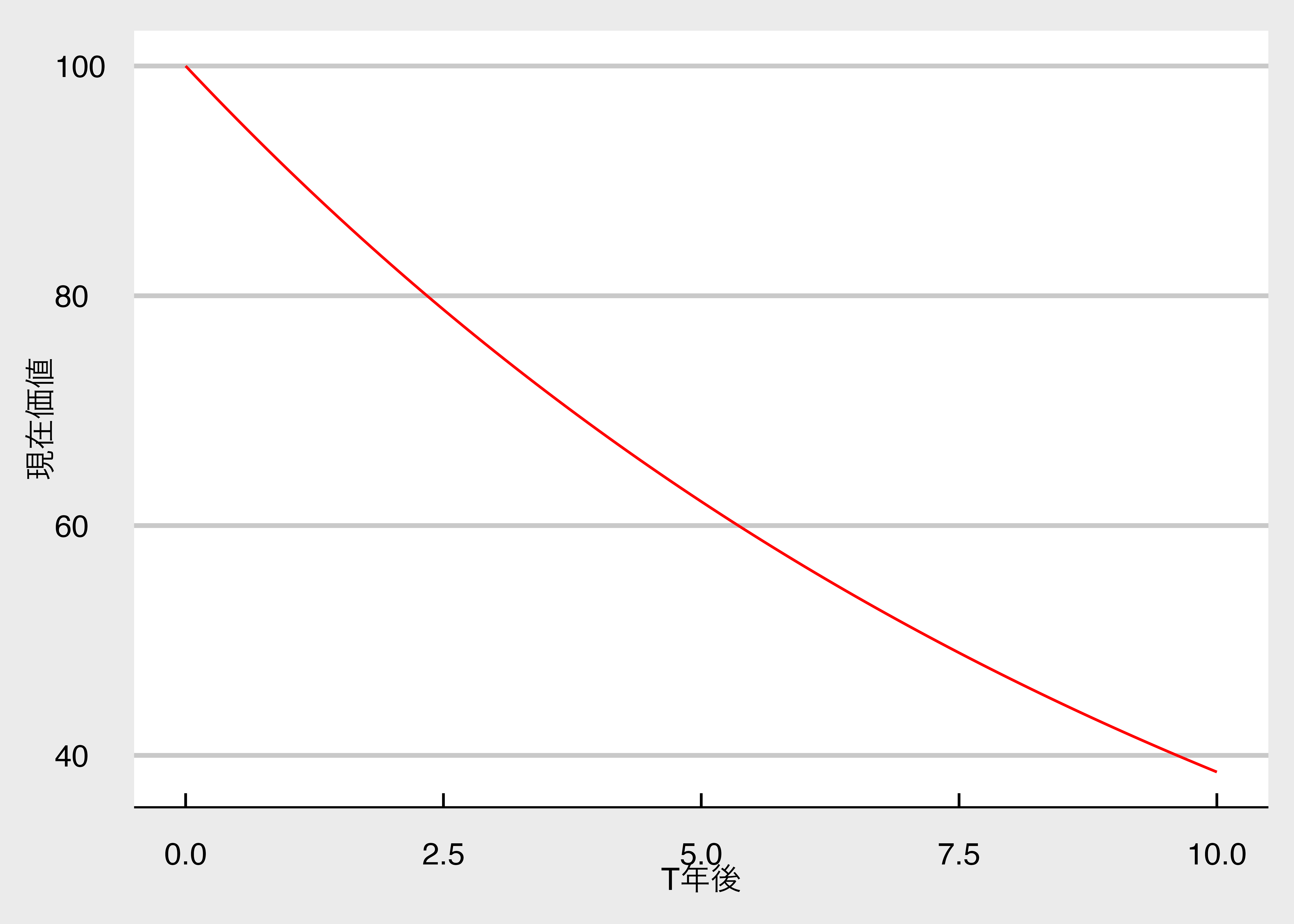 T <- c(seq(0, 10, by = 0.1)) # 将来受け取る時点