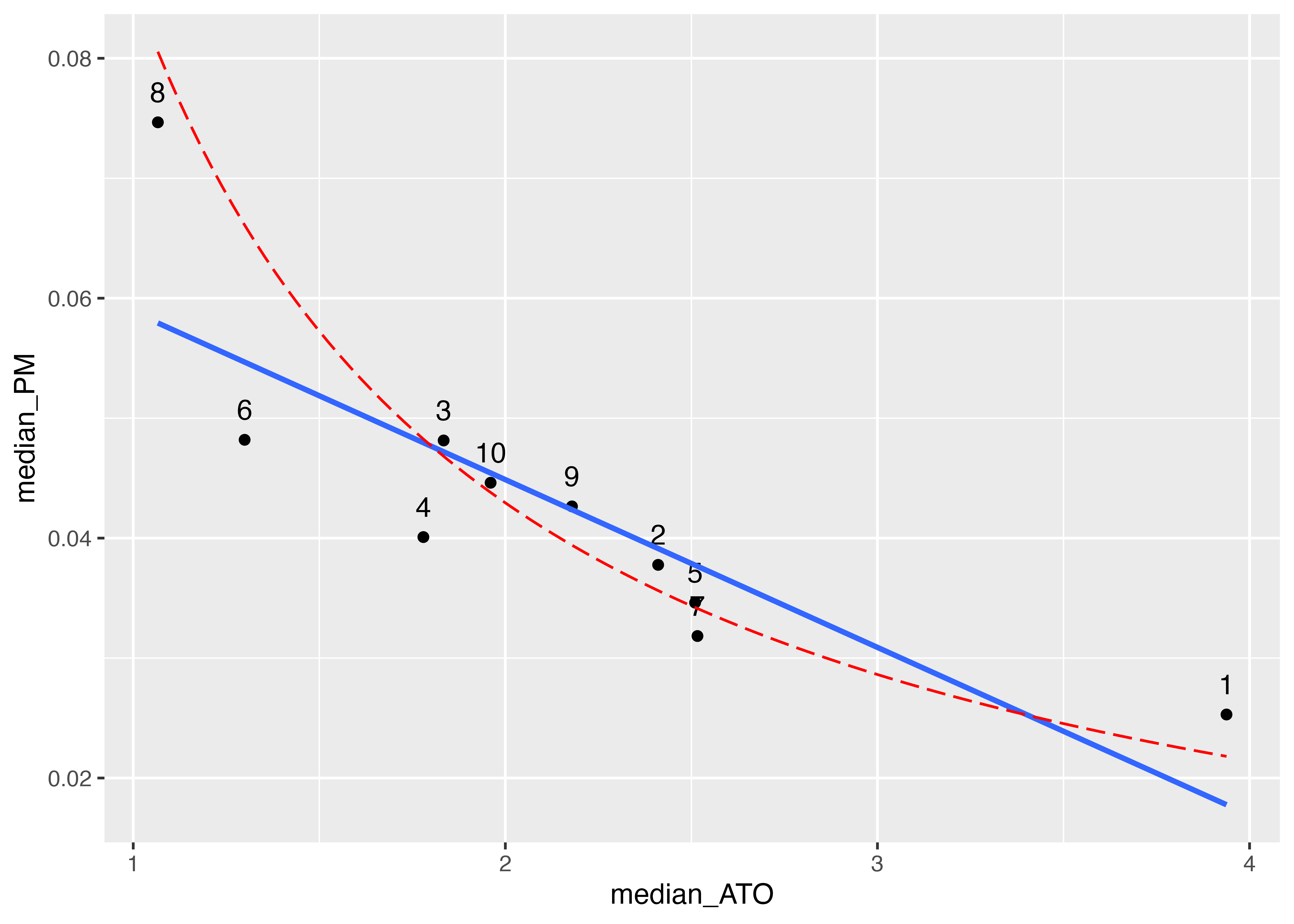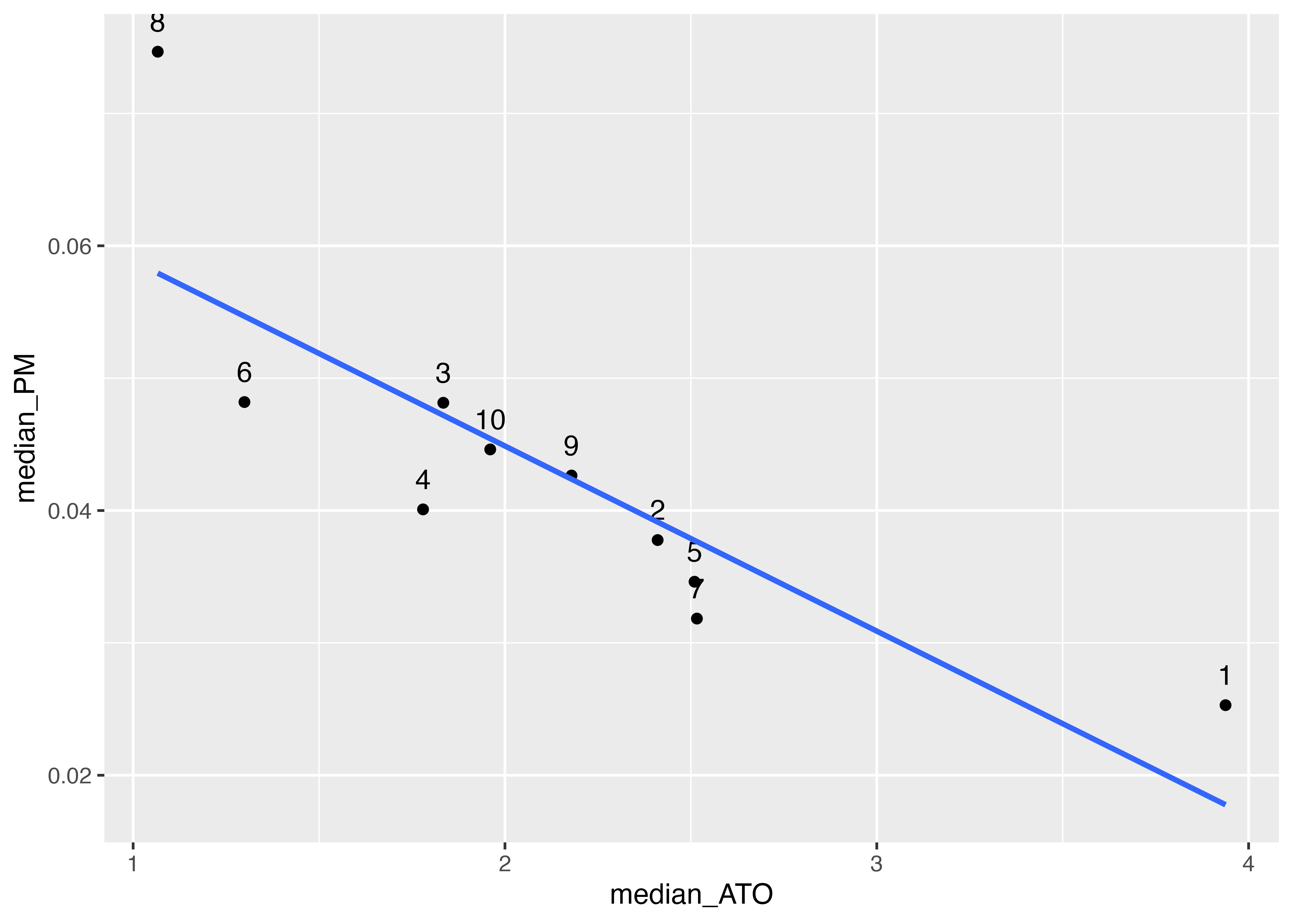 print(g)この産業ごとに計算された中央値のデータを用いて,線形回帰直線を引いて,ATOとPMの関係を見てみます。