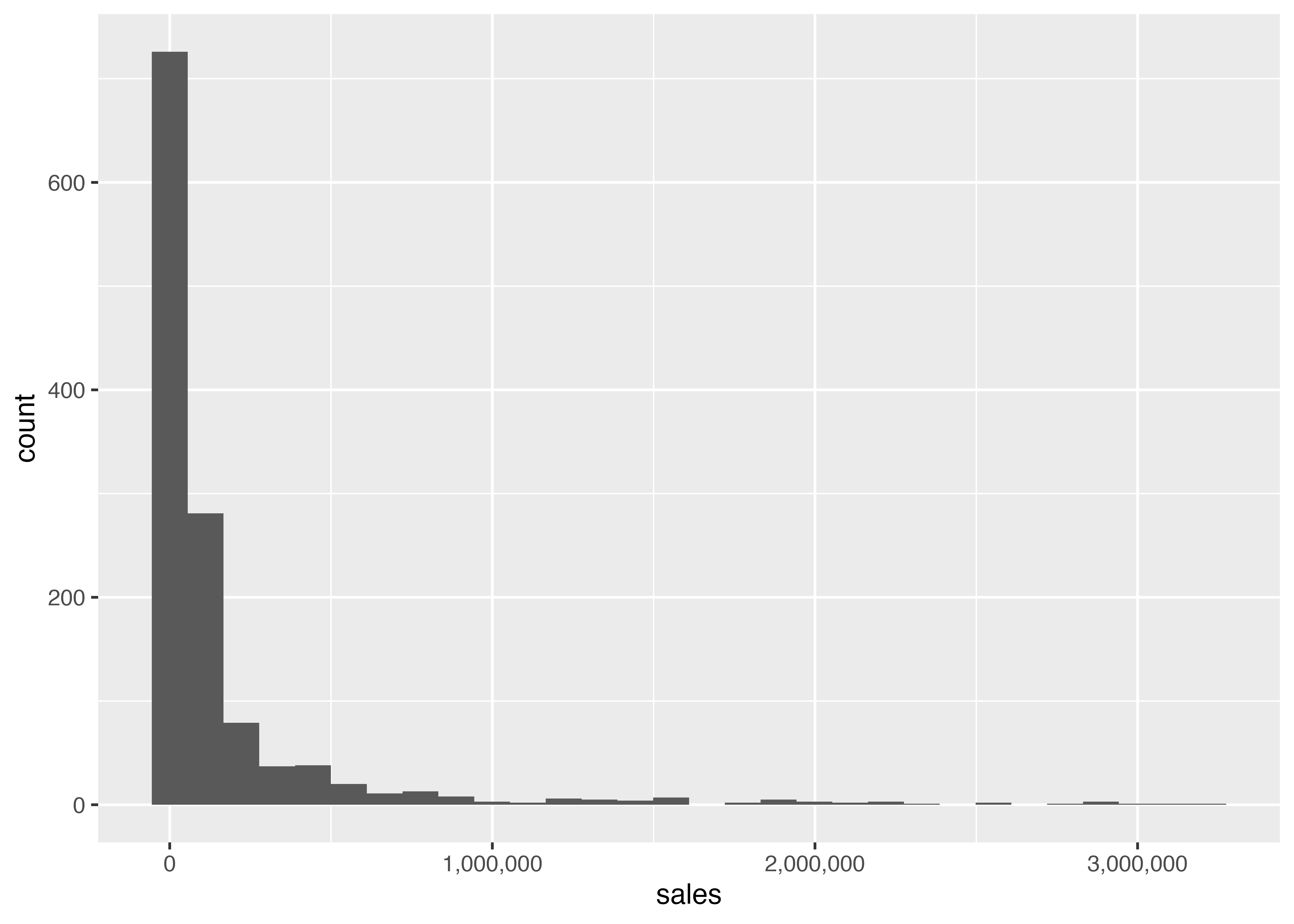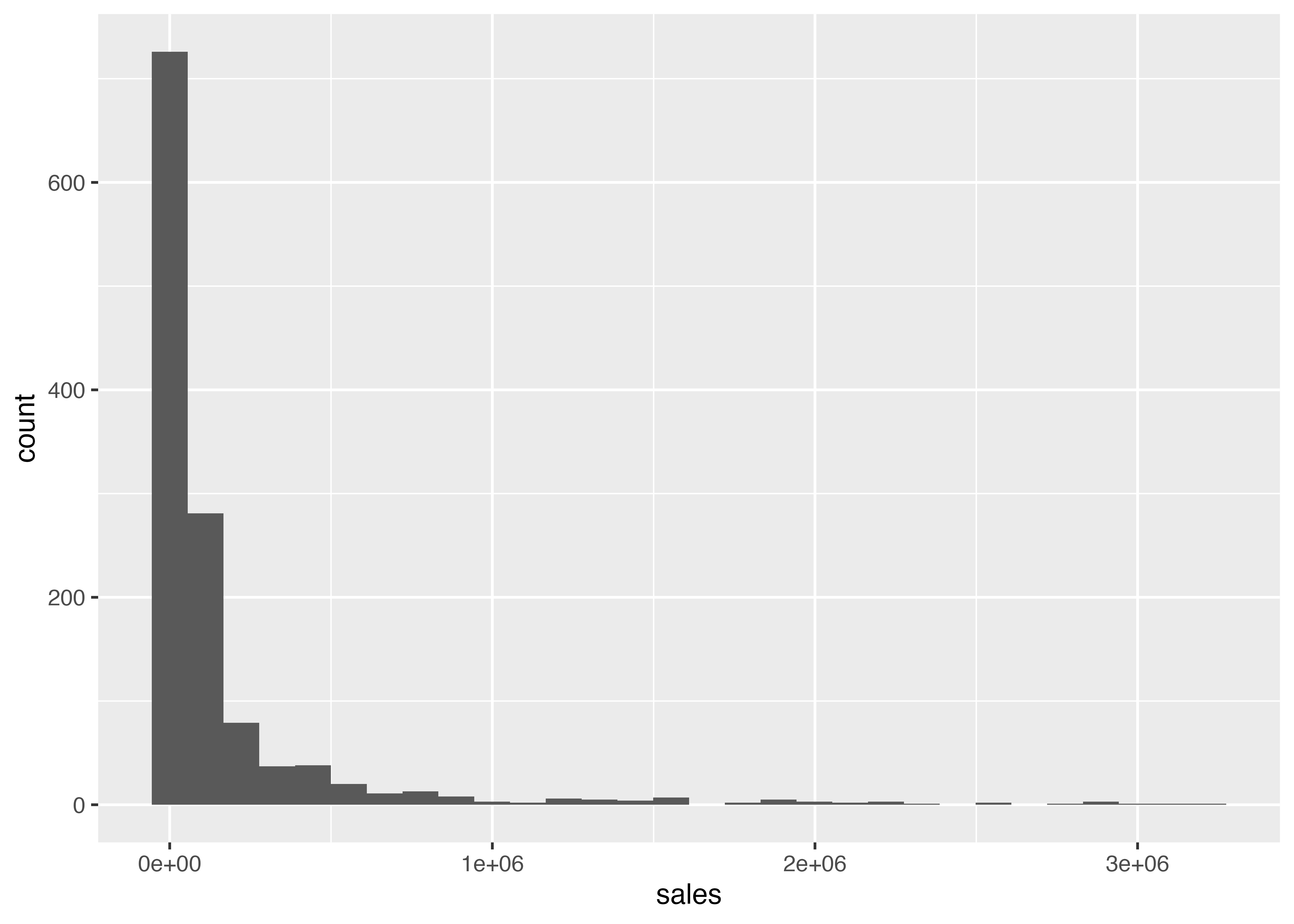 | sales | 0 | 1 | 166007.00 | 381980.29 | 205.34 | 16103.33 | 40430.74 | 118313.82 | 3496433.0 | ▇▁▁▁▁ |