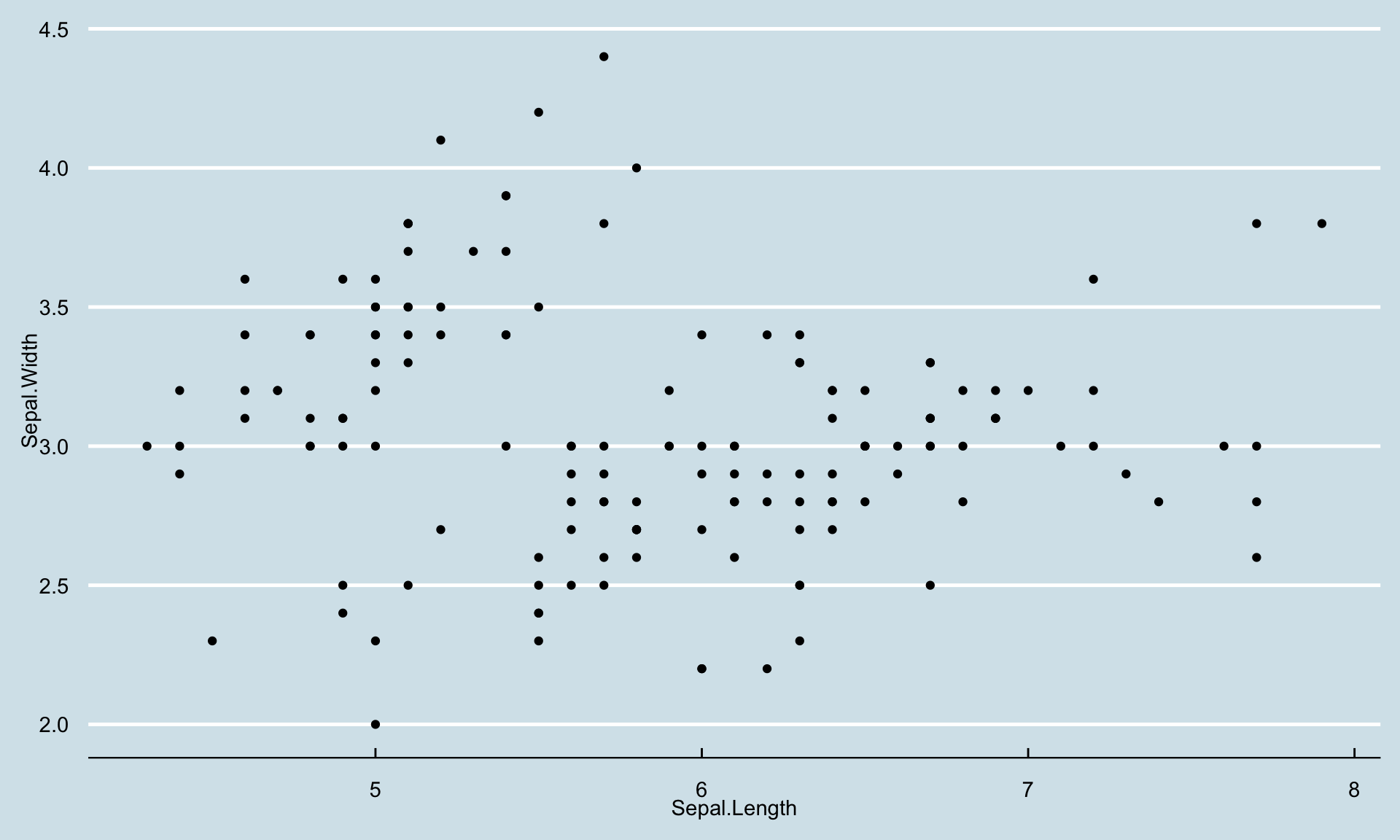 ggplot(iris) + aes(x = Sepal.Length, y = Sepal.Width) +