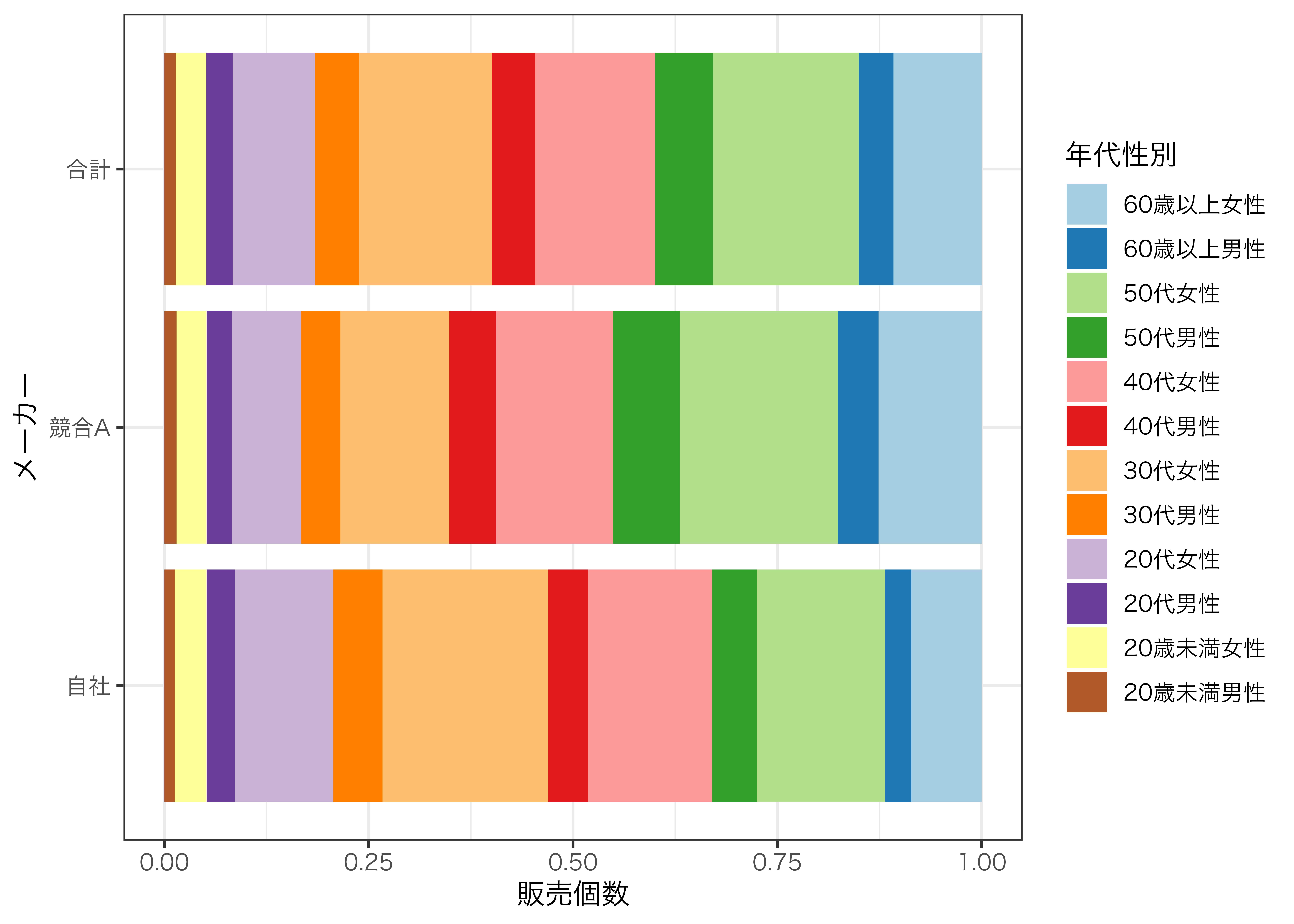 df_jisha_age_sex_num| 年代 | 性別 | 販売個数合計 |
