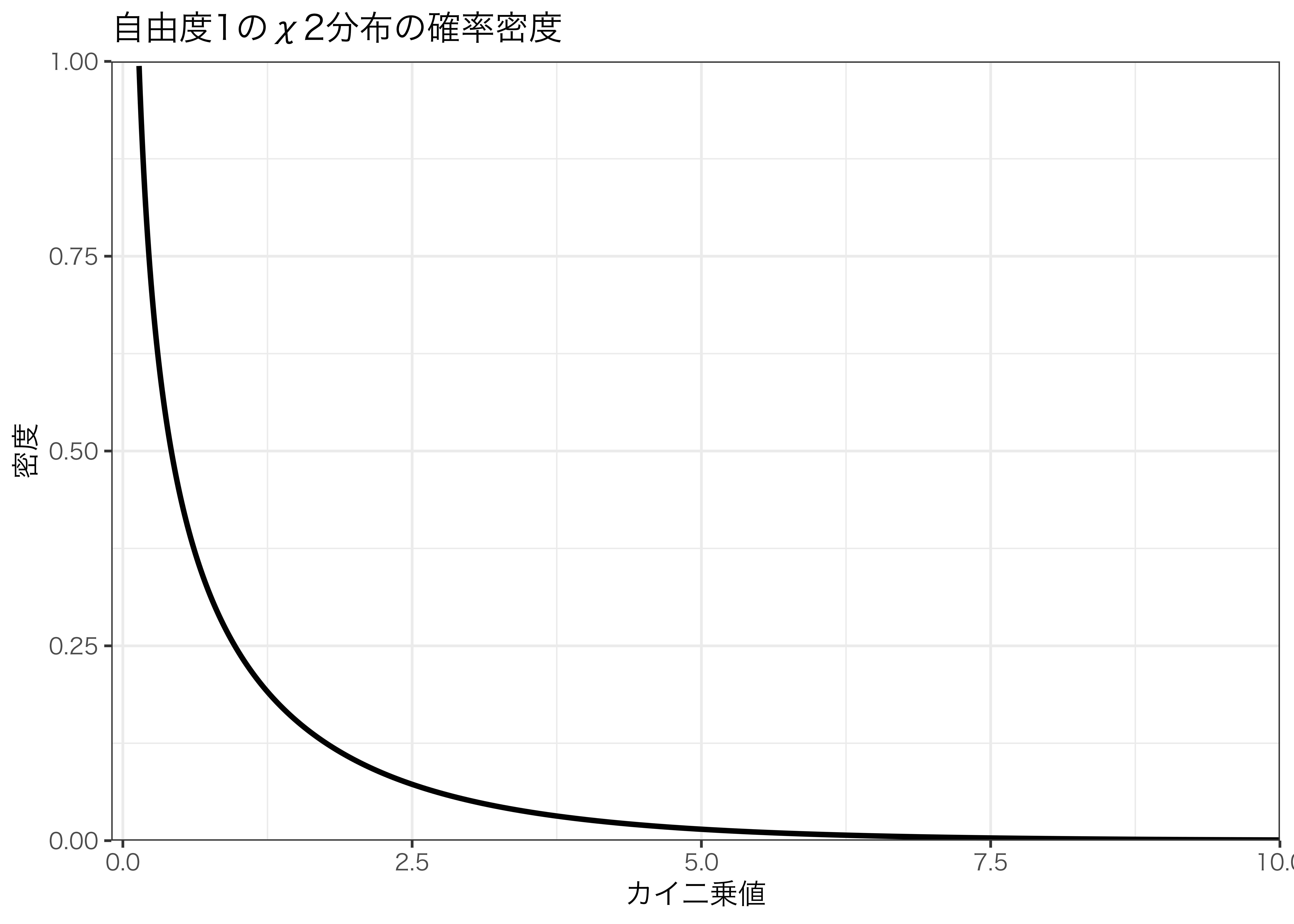 ggtitle("自由度1のχ2分布の確率密度") + # タイトル