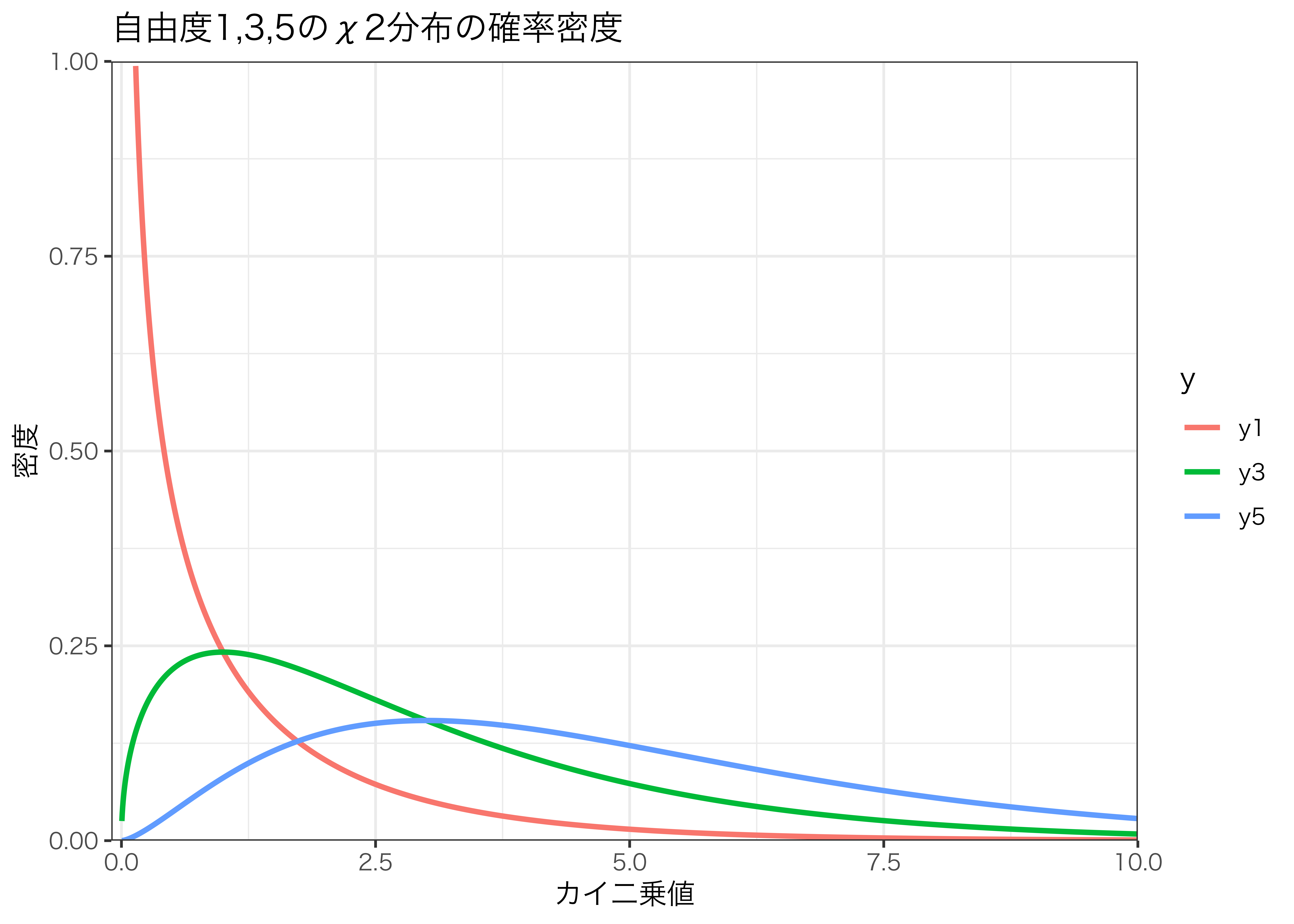 p <- p + ggtitle("自由度1,3,5のχ2分布の確率密度") +