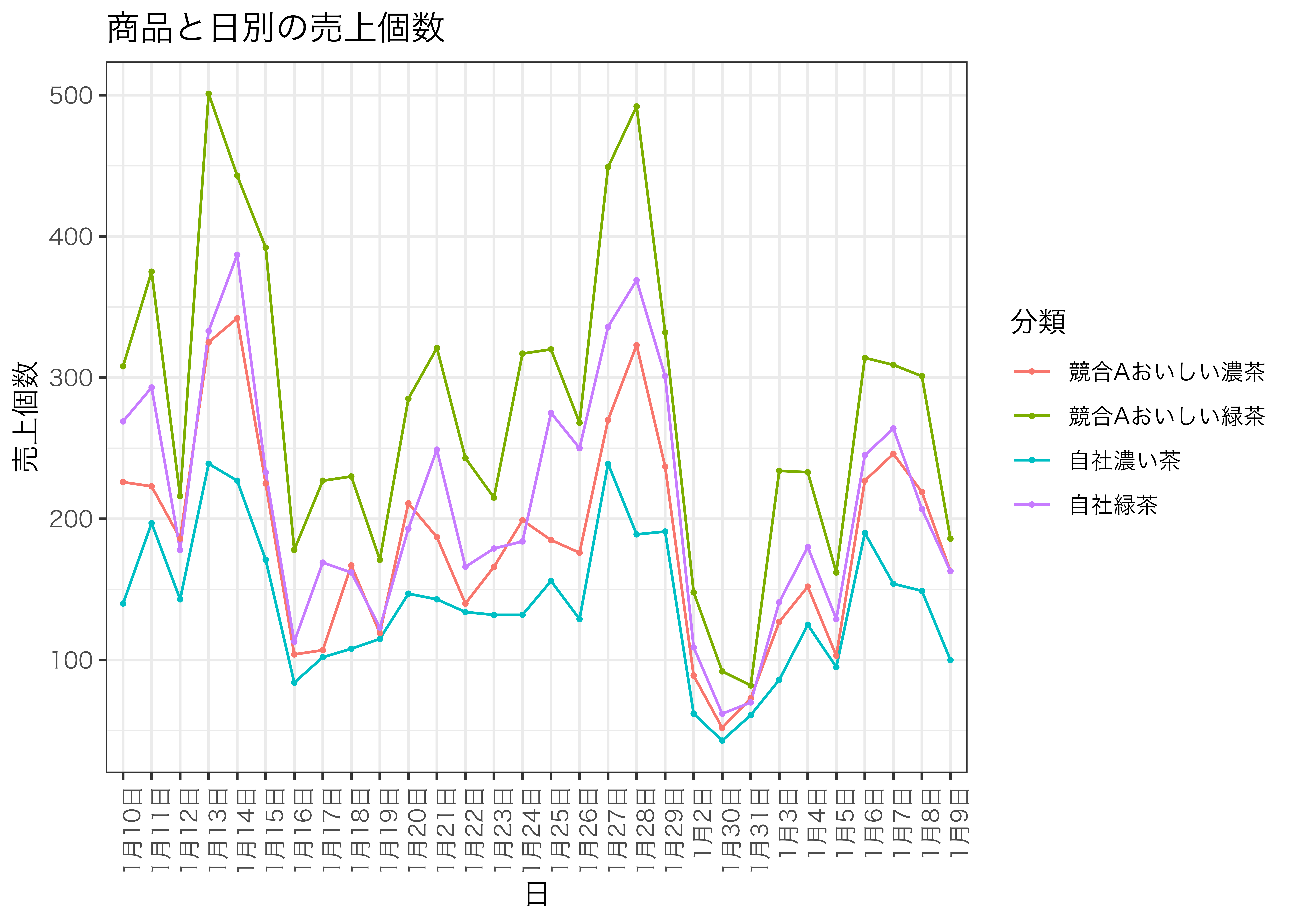 ggplot(aes(x = 月日, y = 売上個数, group = 分類, color = 分類)) +