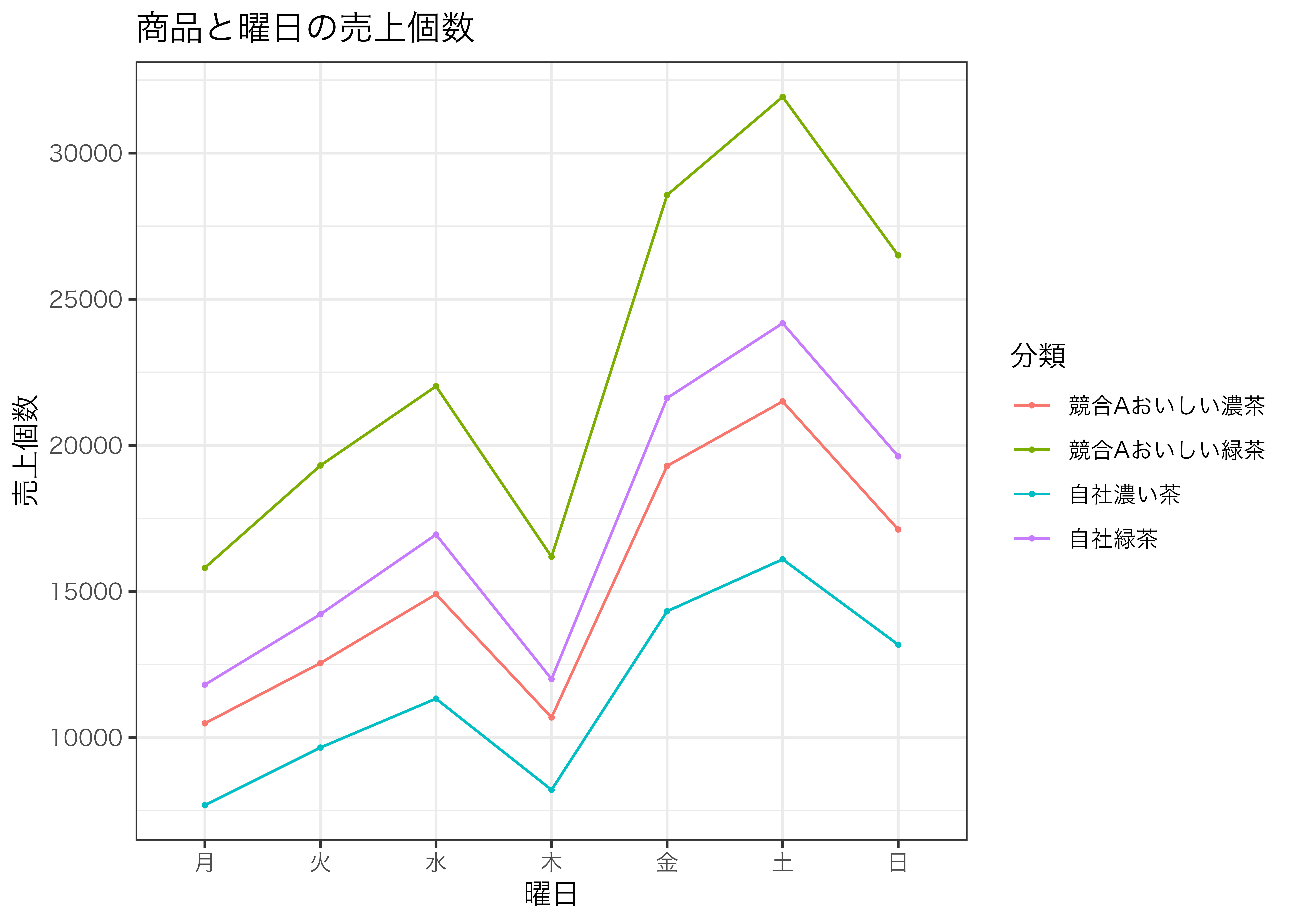 ggplot(aes(x = 曜日, y = 売上個数, group = 分類, color = 分類)) +