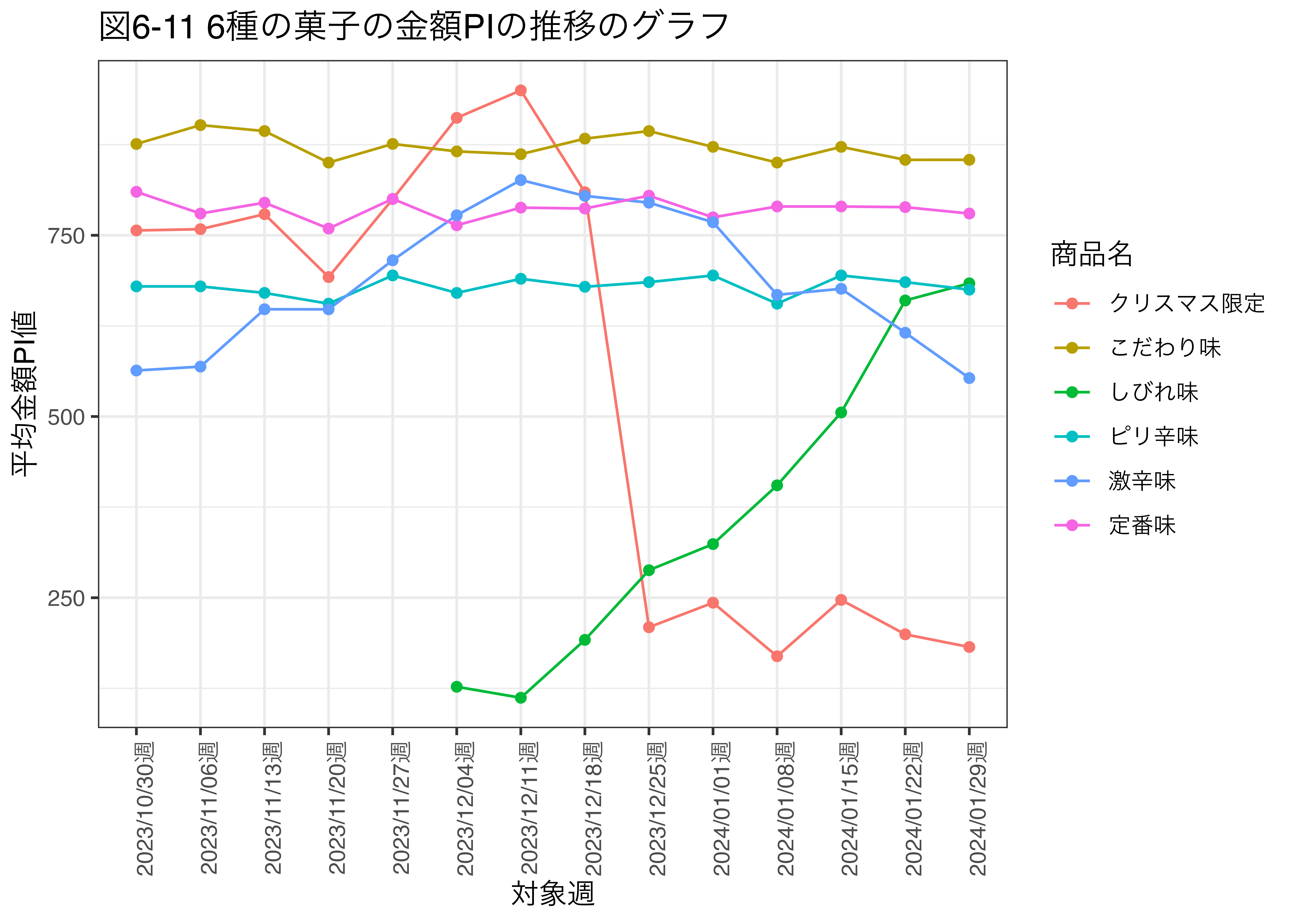labs(title = "図6-11 6種の菓子の金額PIの推移のグラフ") +