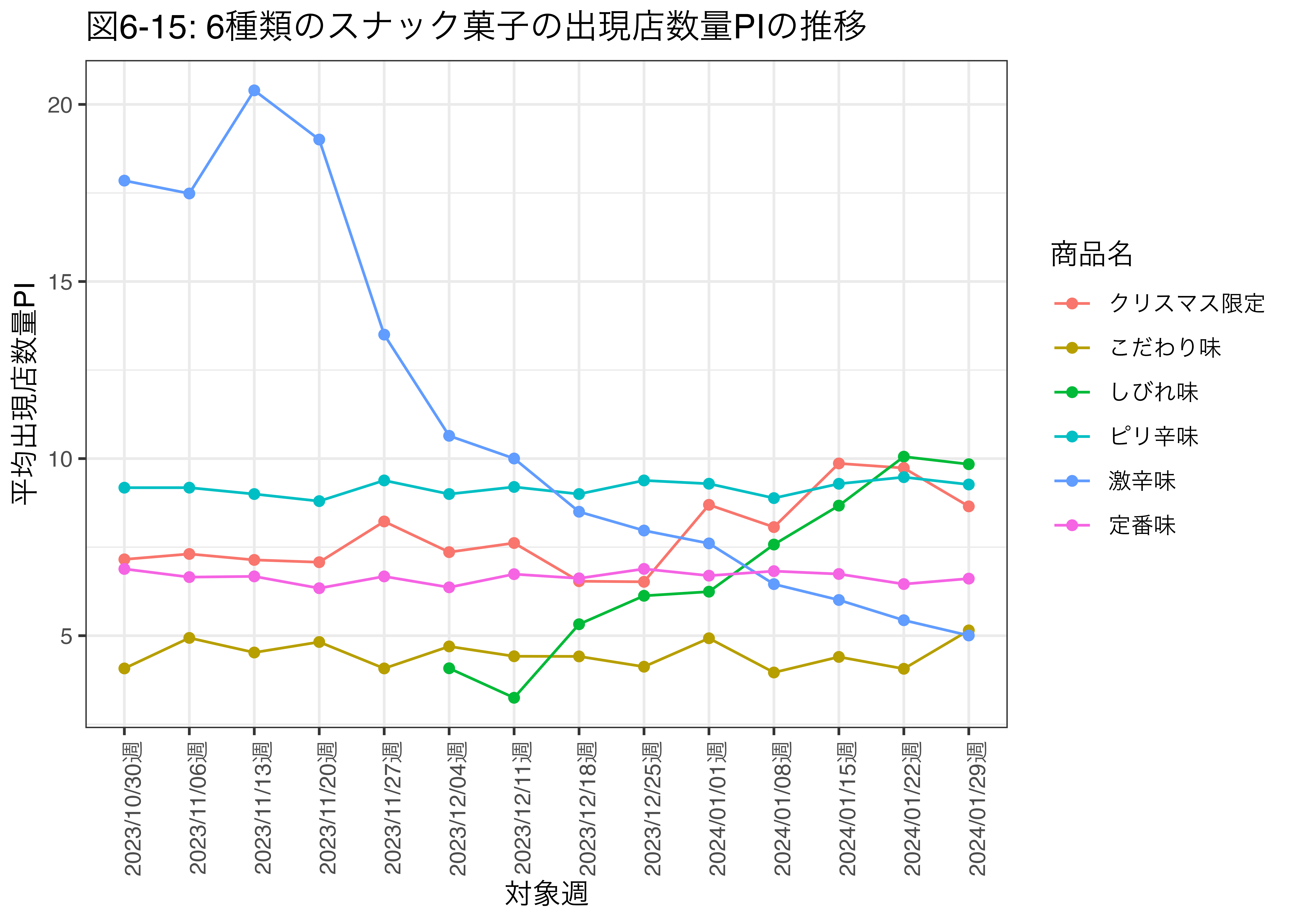 labs(title = "図6-15: 6種類のスナック菓子の出現店数量PIの推移") +