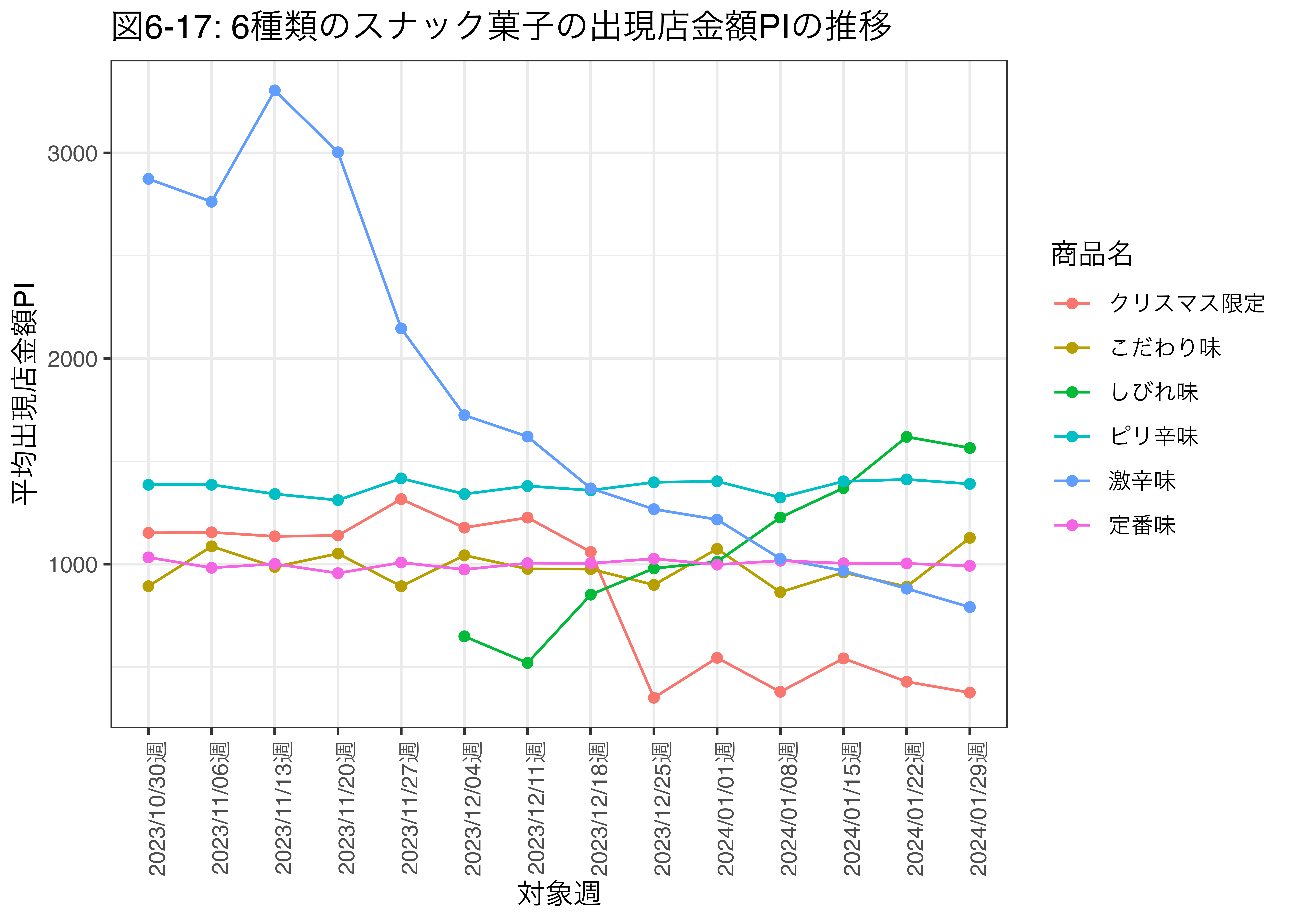 labs(title = "図6-17: 6種類のスナック菓子の出現店金額PIの推移") +