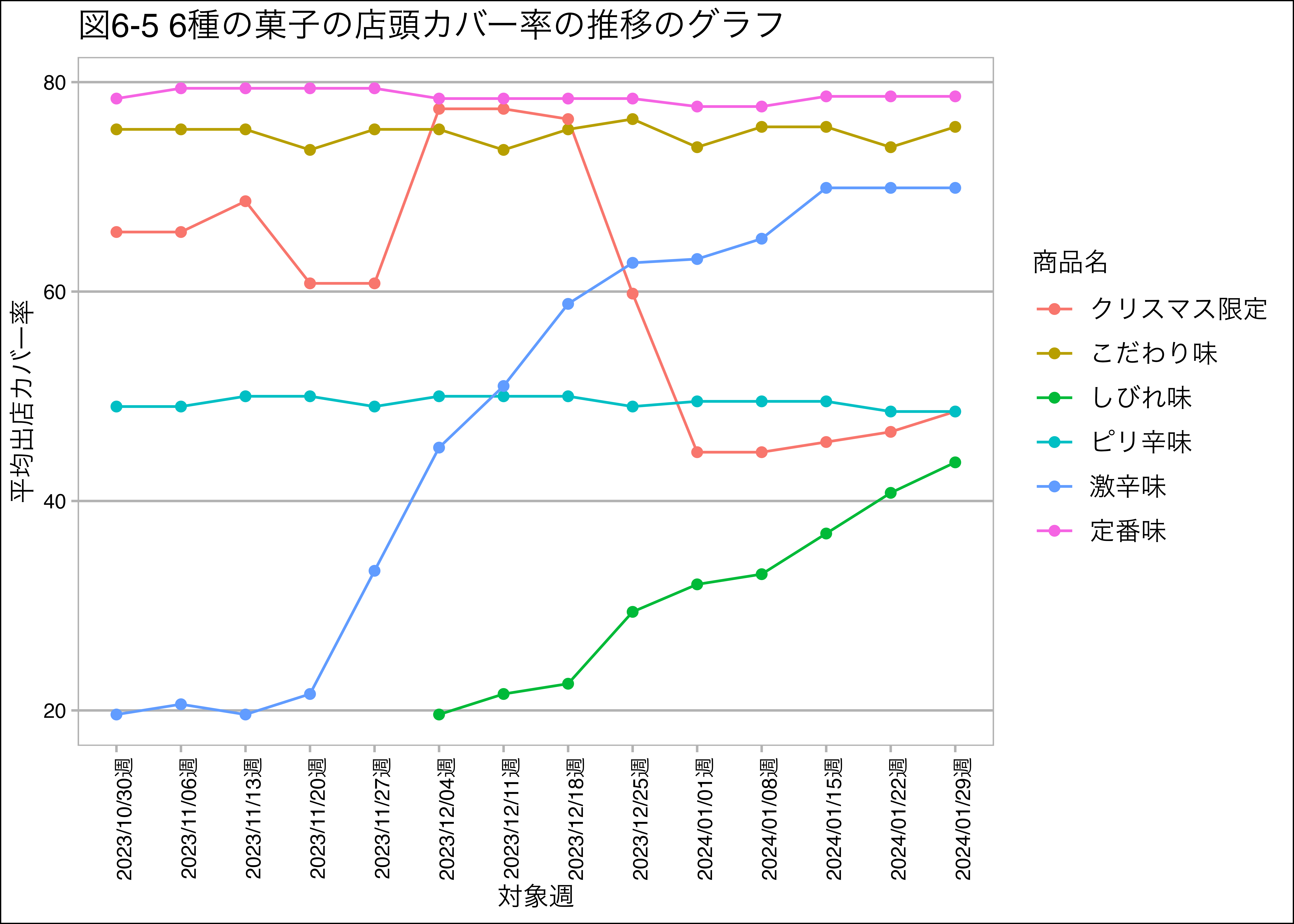 labs(title = "図6-5 6種の菓子の店頭カバー率の推移のグラフ") +