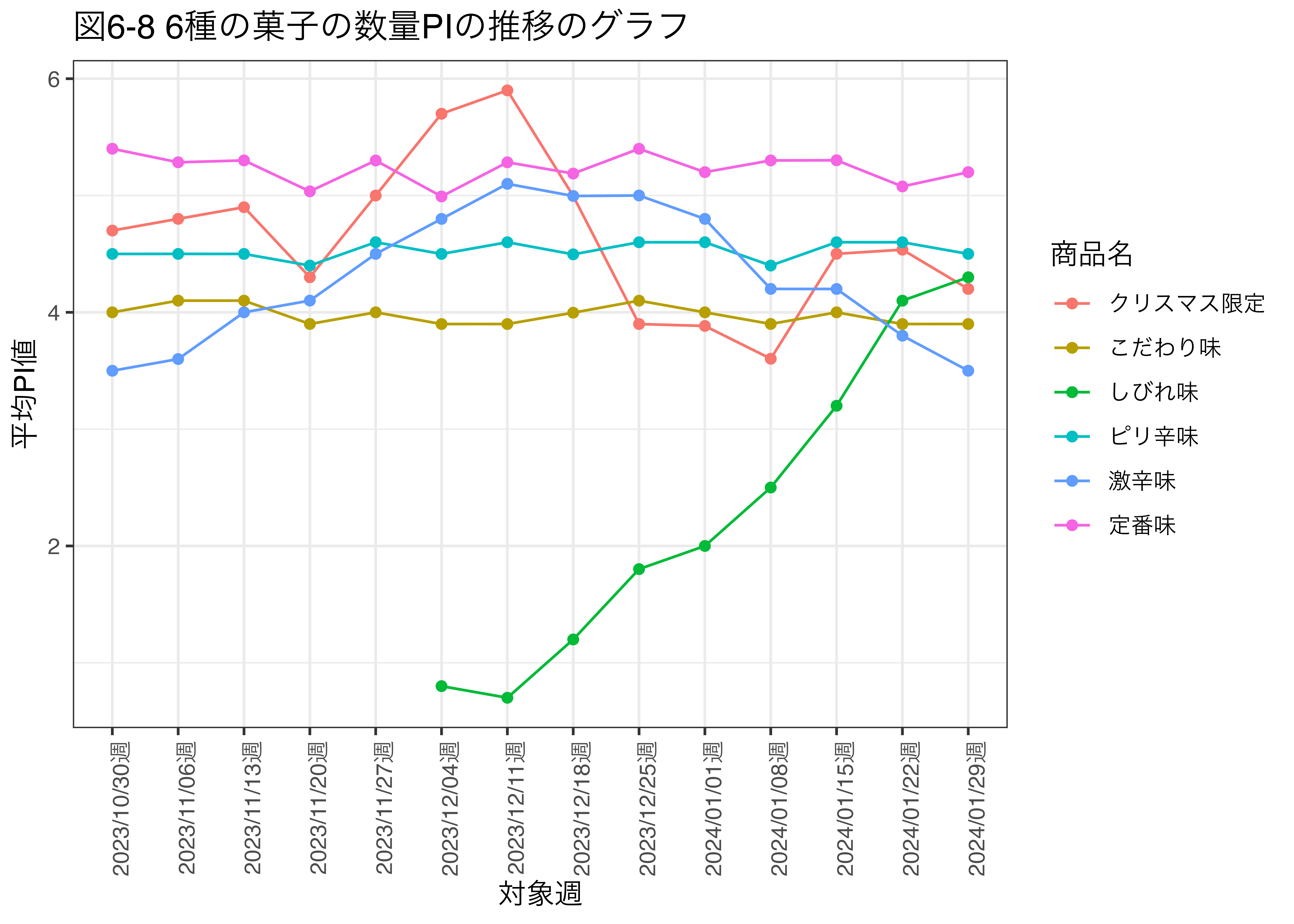 labs(title = "図6-8 6種の菓子の数量PIの推移のグラフ") +