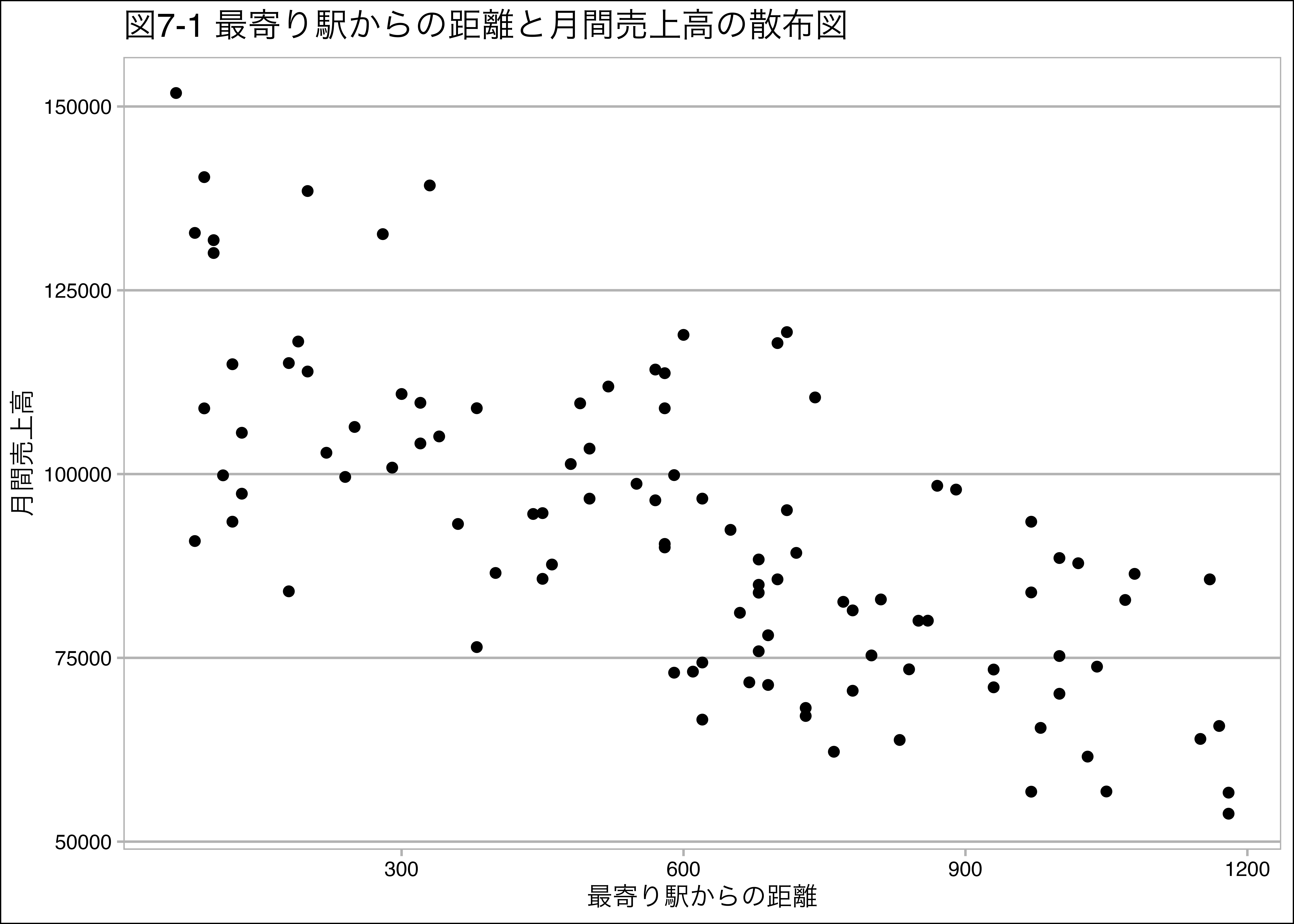 labs(title = "図7-1 最寄り駅からの距離と月間売上高の散布図") + mystyle