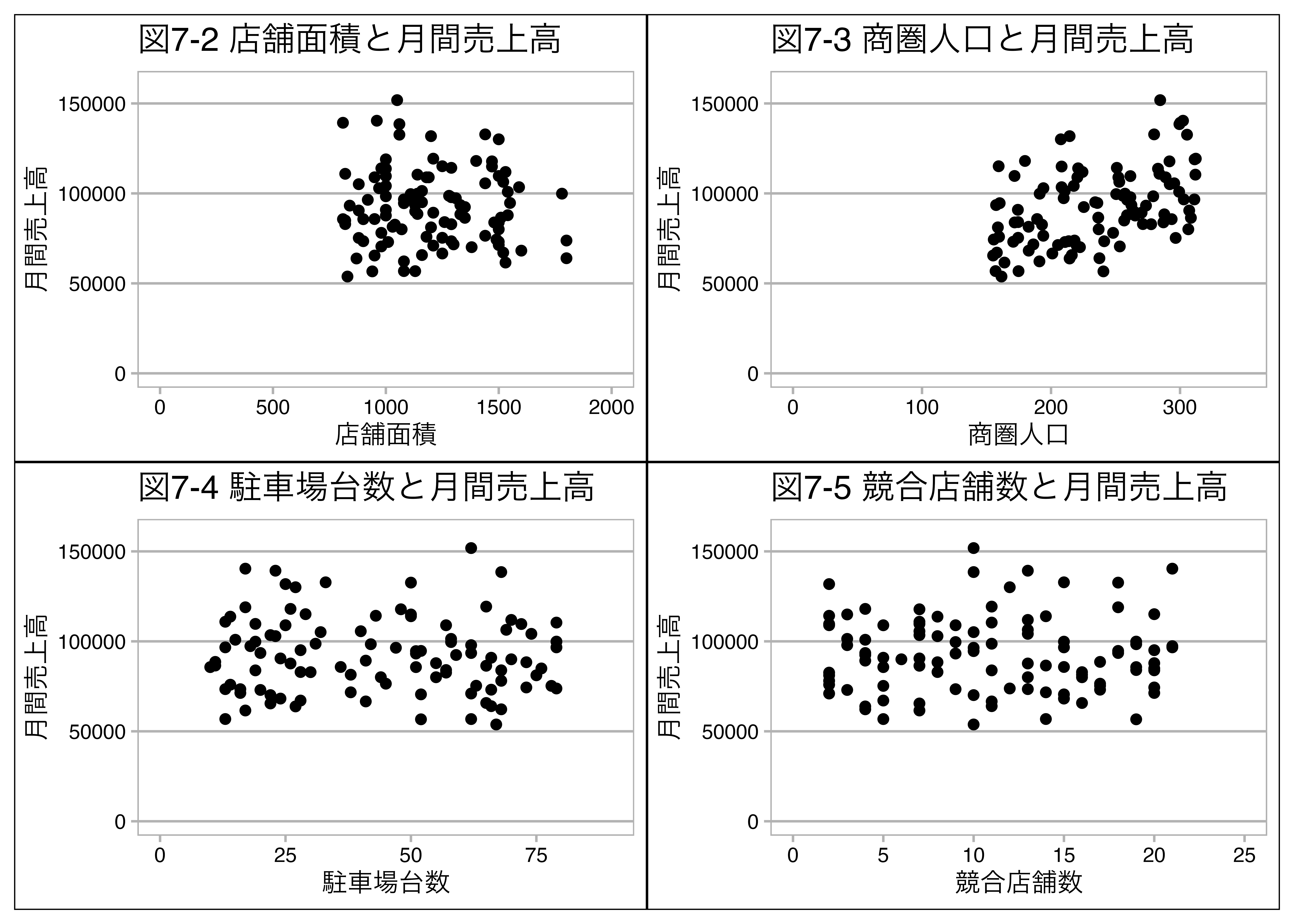 labs(title = "図7-2 店舗面積と月間売上高") + mystyle