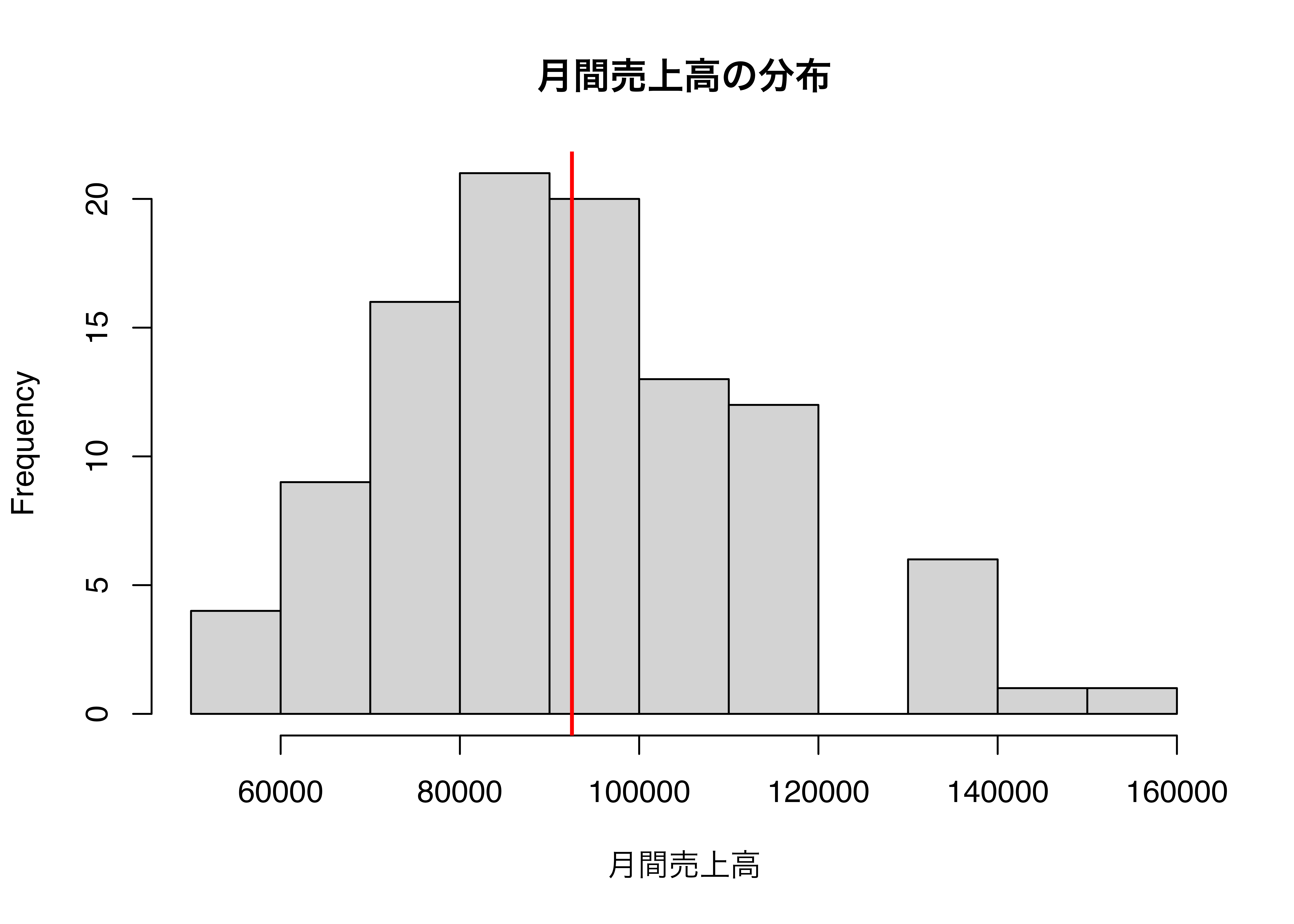 abline(v = mean(df$月間売上高), col = "red", lwd = 2) # 平均値に赤線を追加
