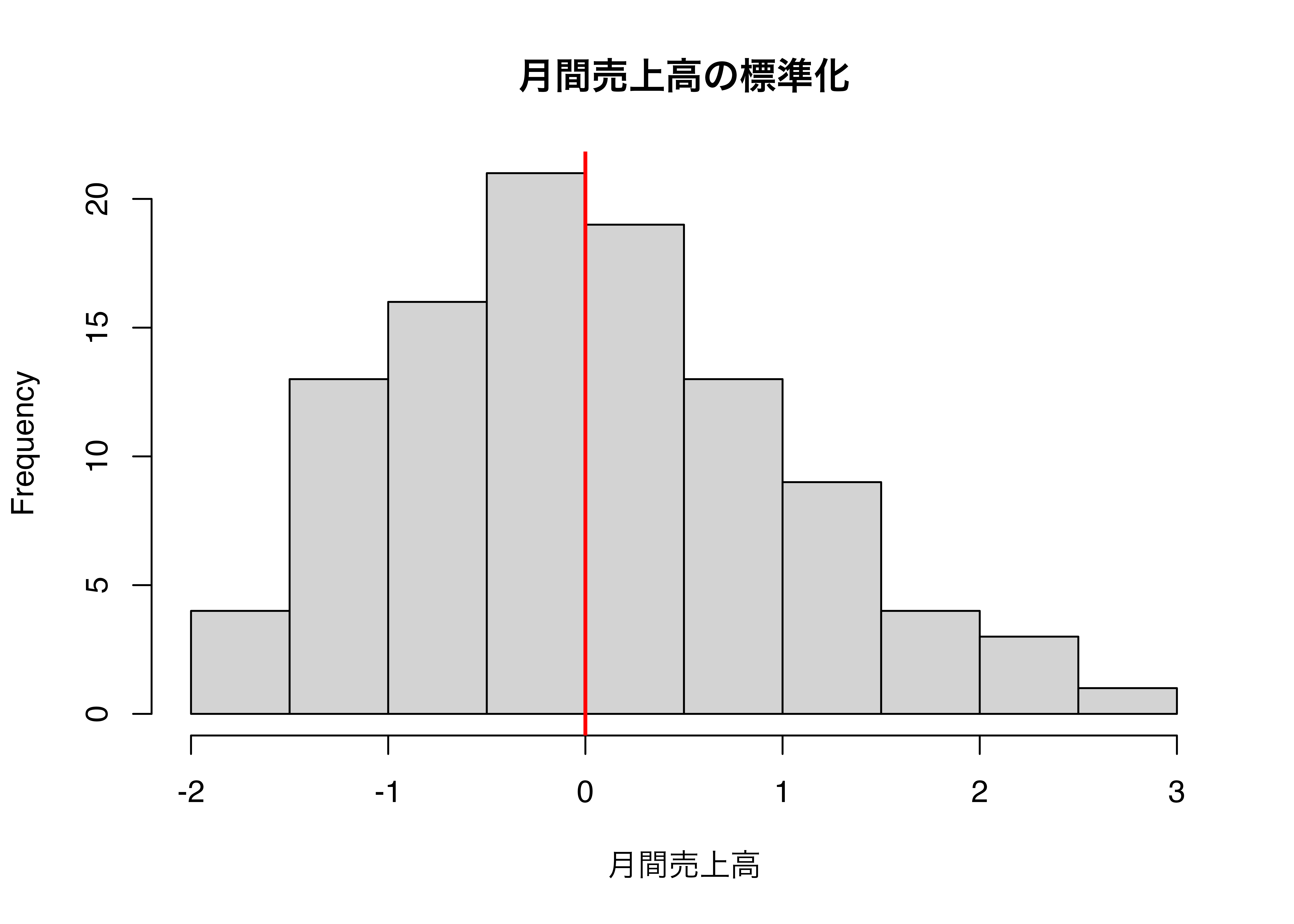 hist(scale(df$月間売上高), main = "月間売上高の標準化", xlab = "月間売上高") # 標準化したヒストグラム