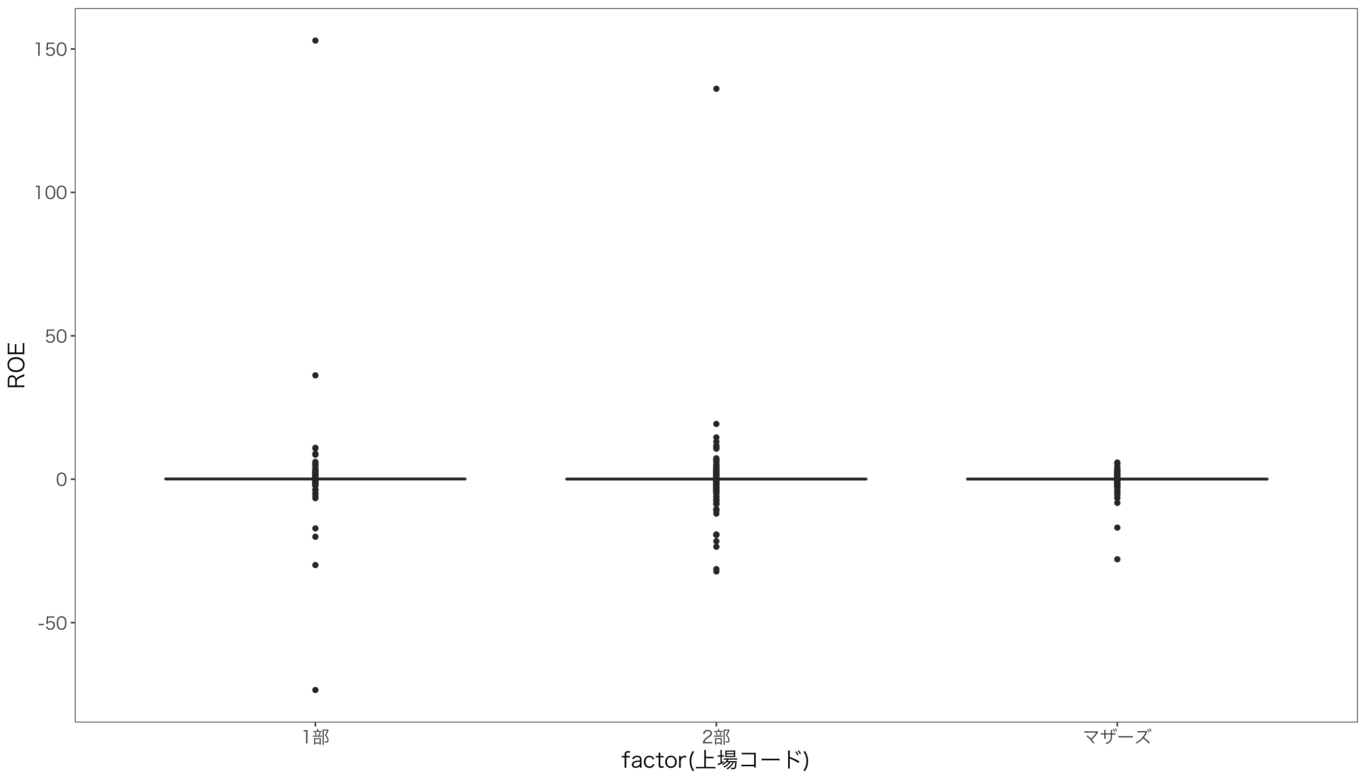 次に,上場場所別ROEの分布を箱ひげ図とバイオリンプロットで比較してみましょう。 箱ひげ図は,geom_boxplot()を使います。