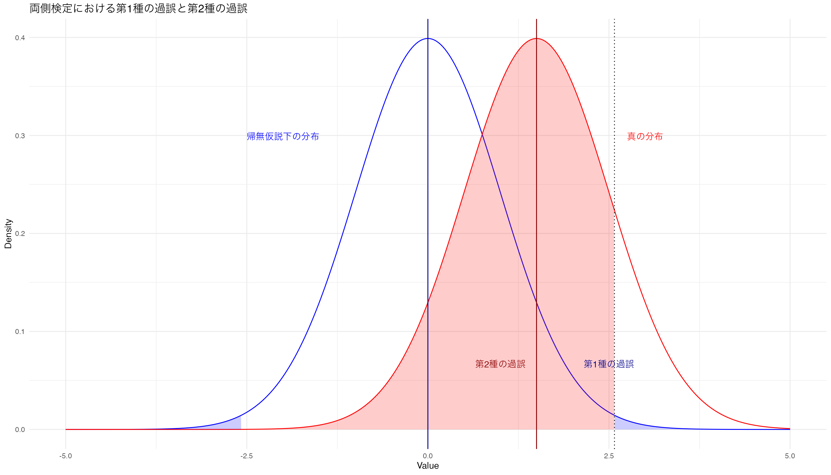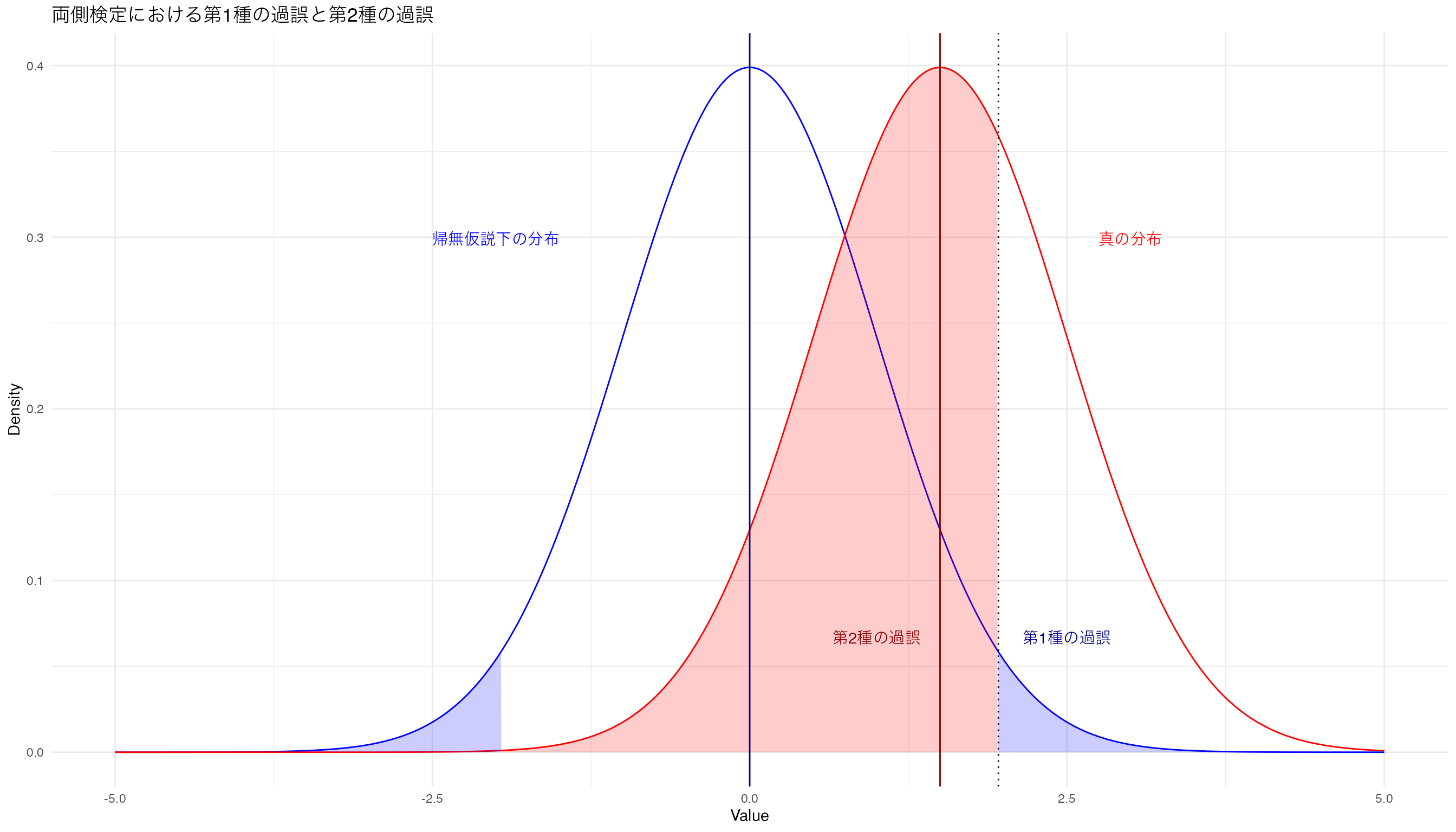 title = "両側検定における第1種の過誤と第2種の過誤")