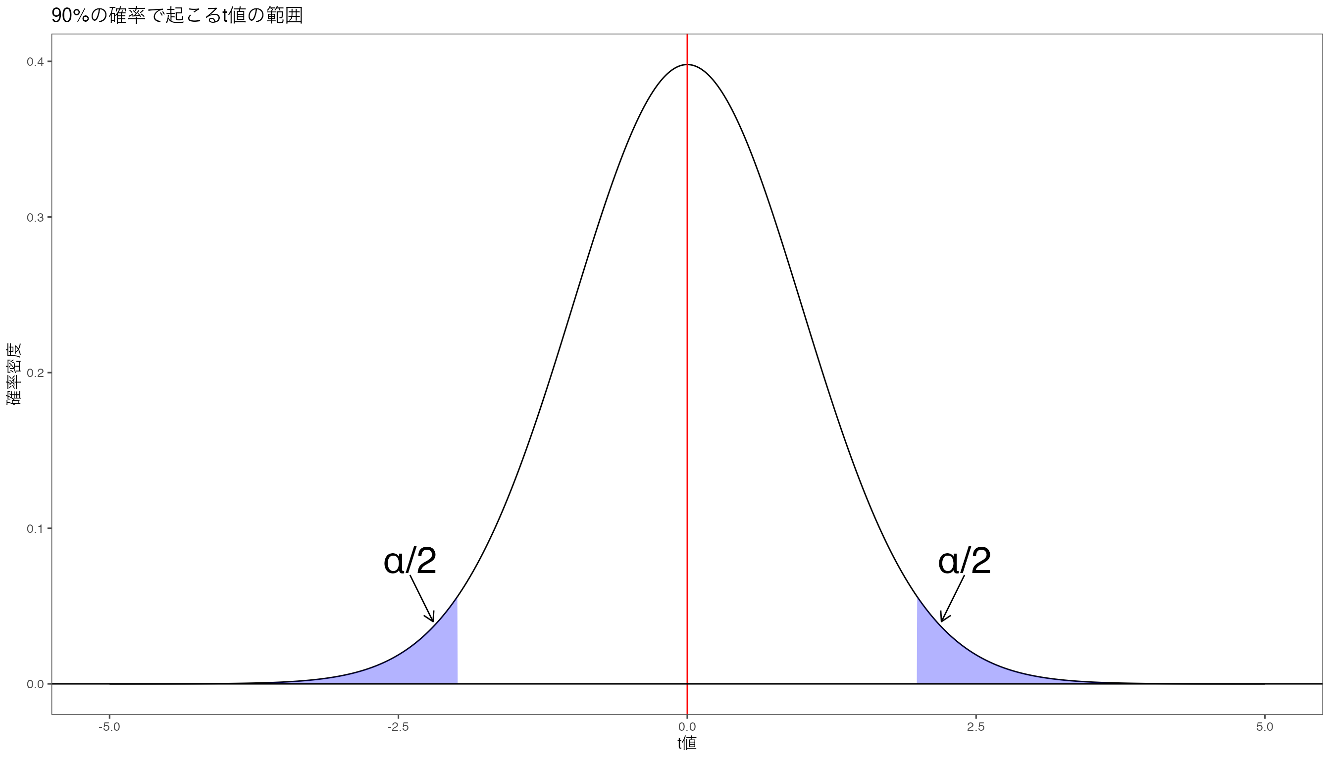 g <- g + xlab("t値") + ylab("確率密度") + labs(title = "90%の確率で起こるt値の範囲")