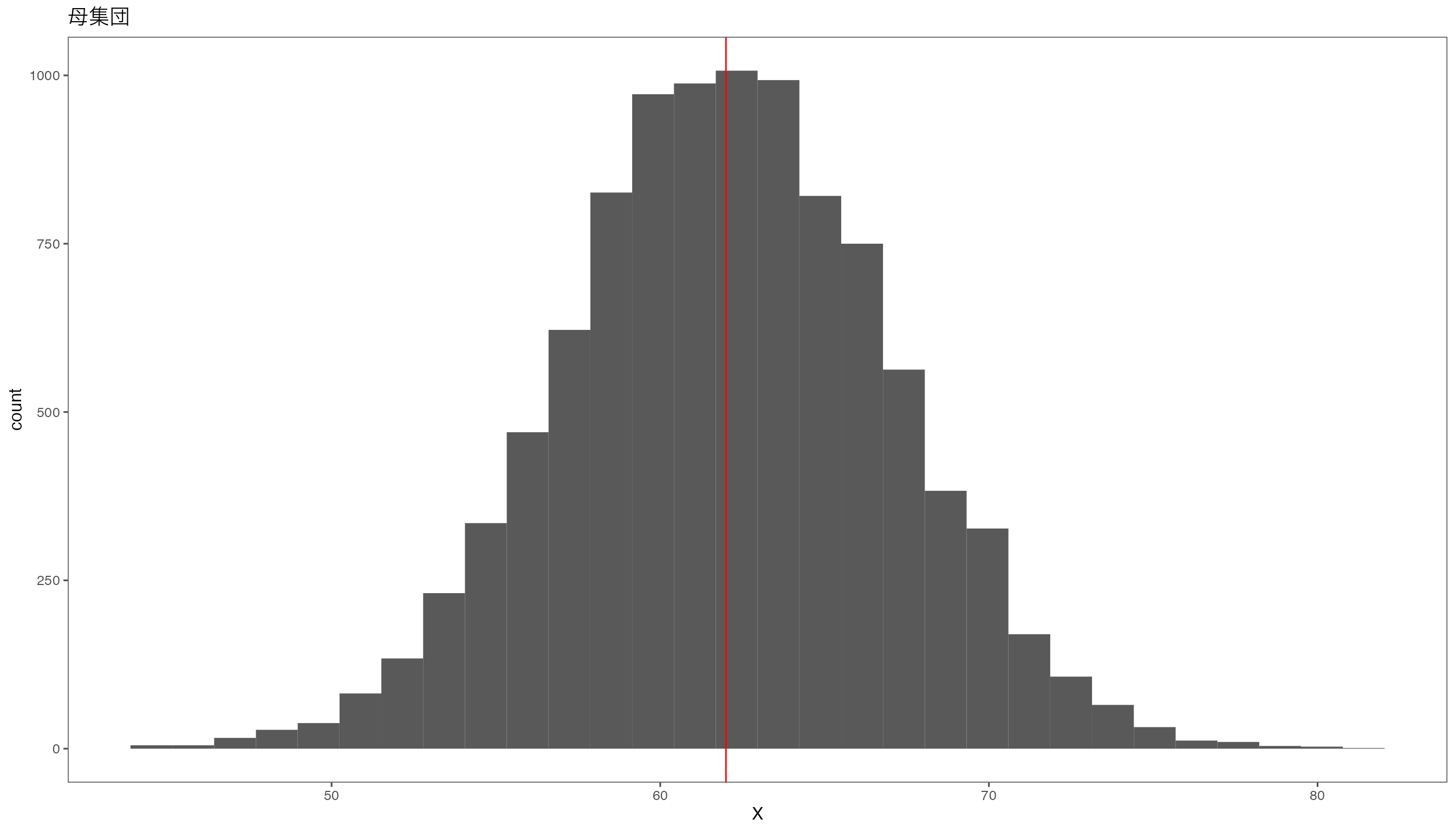 ggplot(data.frame(X)) + aes(X) + geom_histogram() + ggtitle("母集団") + geom_vline(xintercept = 62, color = "red")