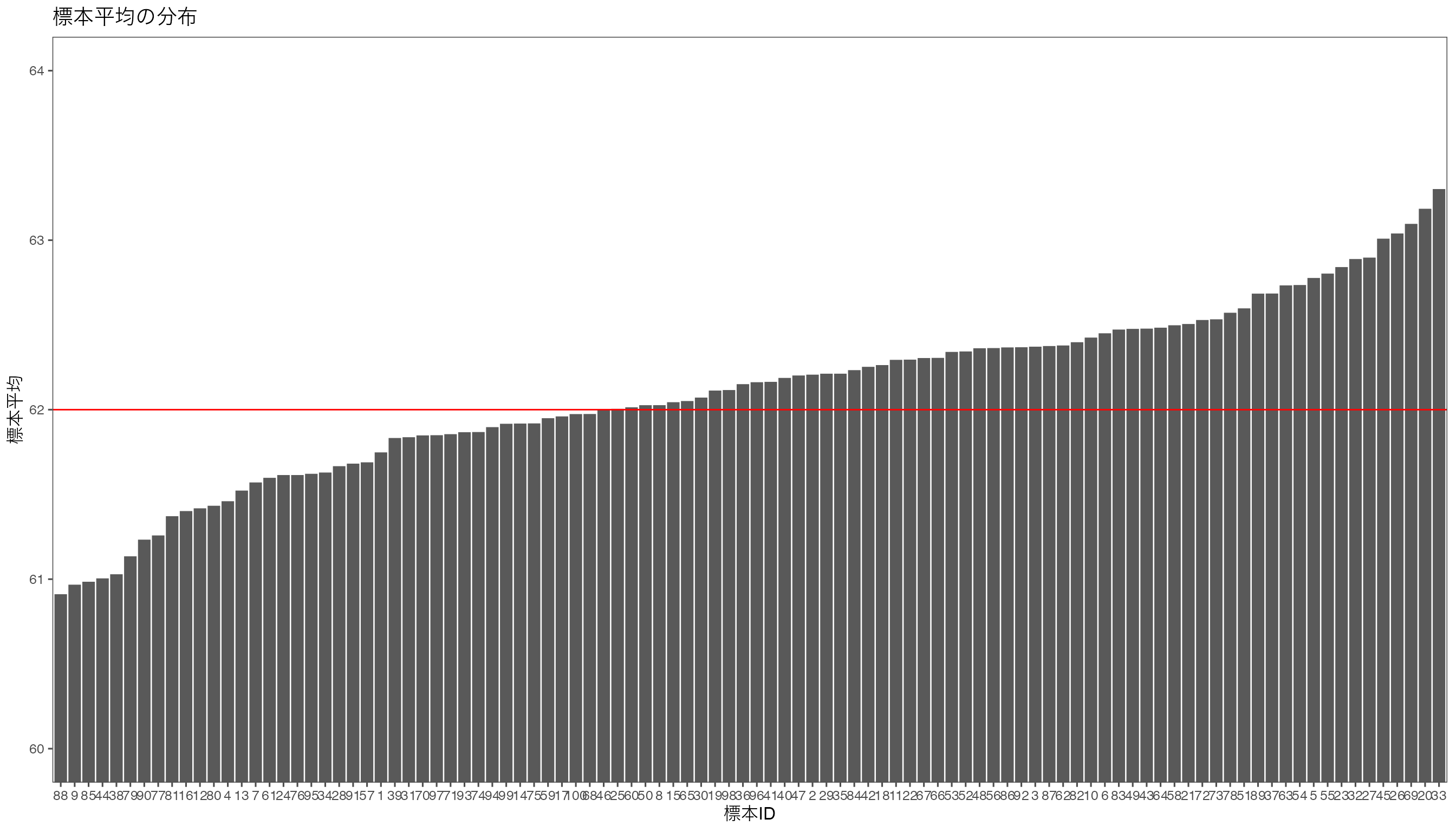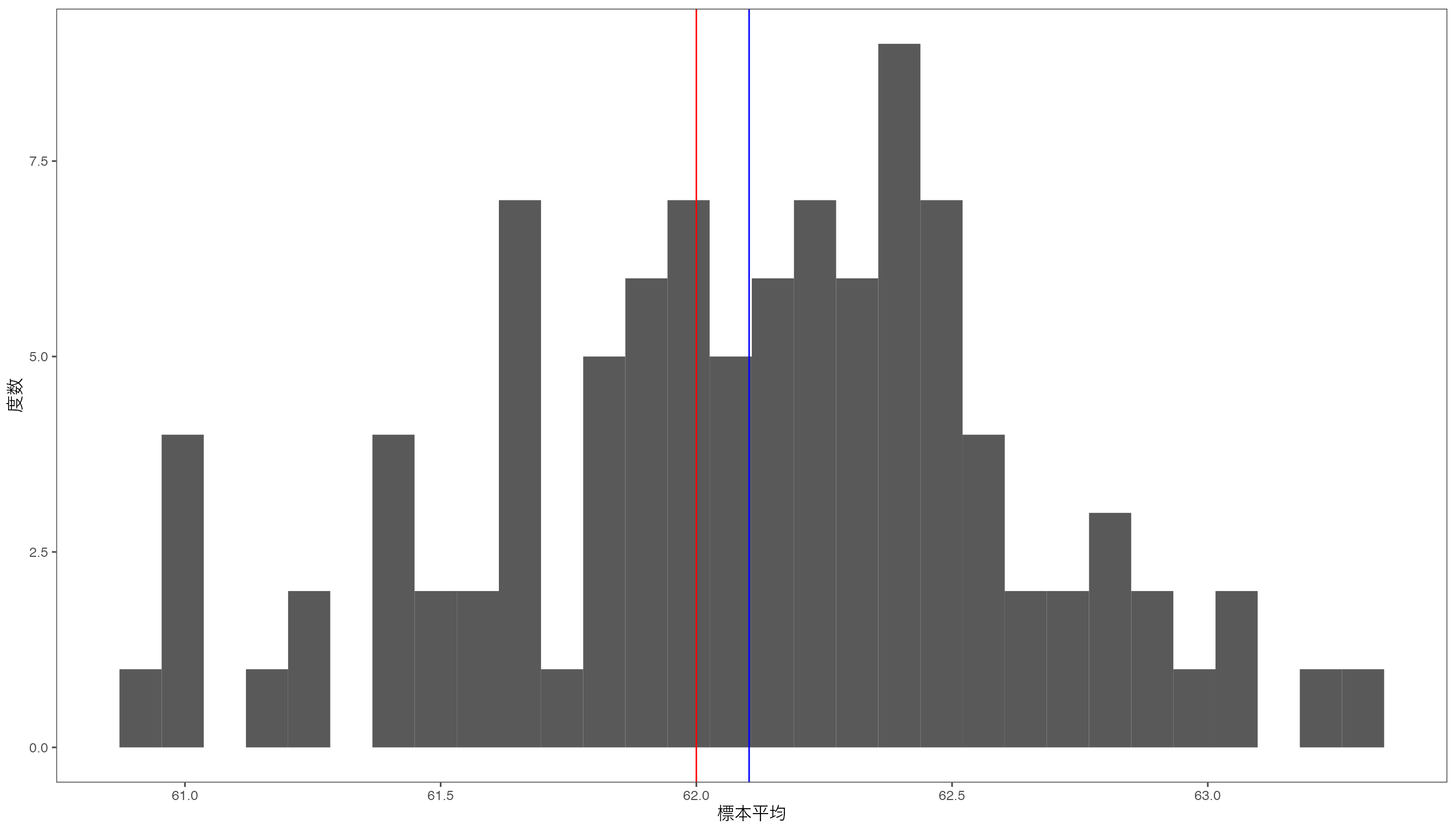 df_mean <- data.frame(sample_mean)たとえば、ある標本の平均値は62.39はこうなります。