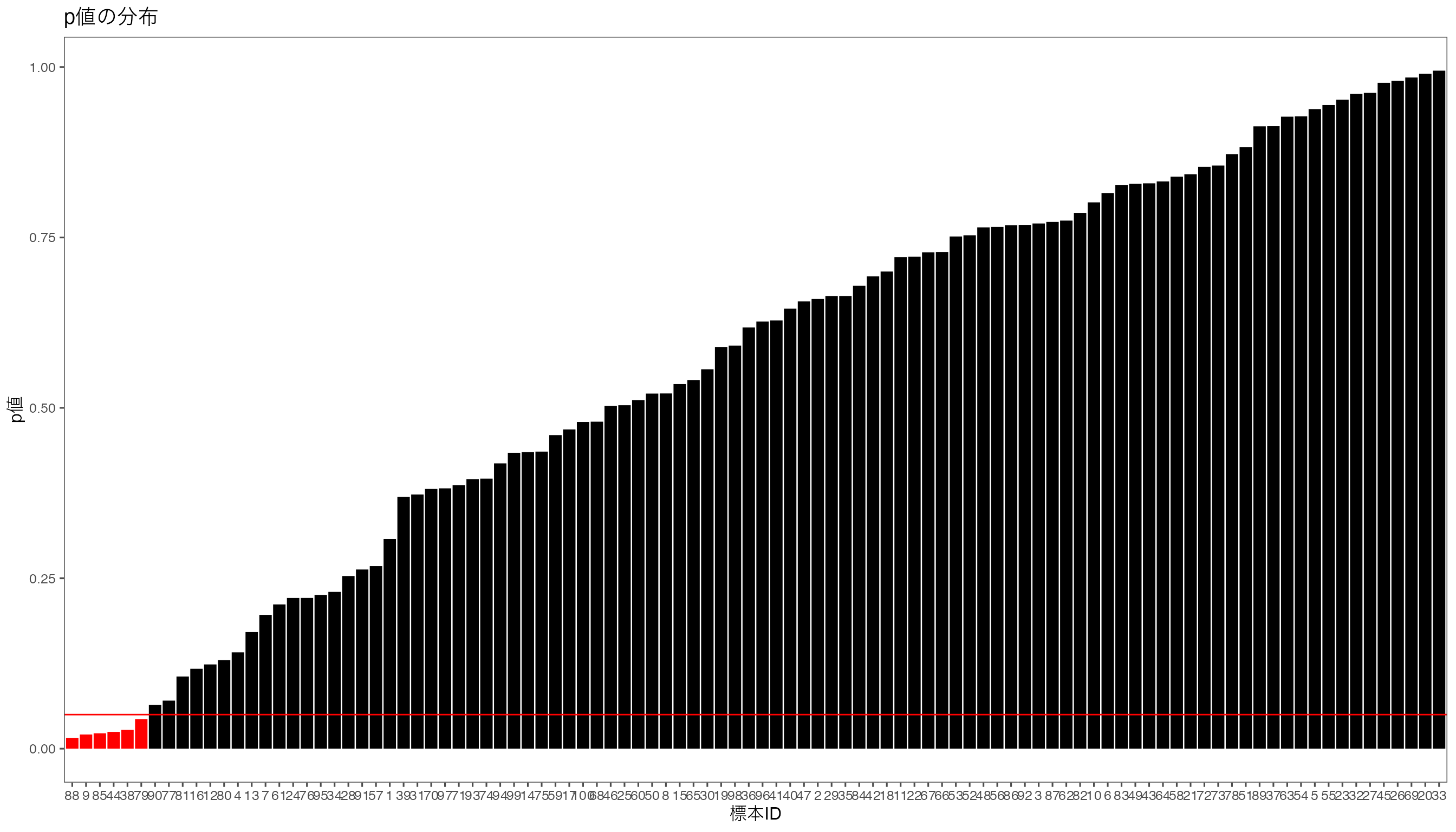 ylab("p値") + xlab("標本ID") + ggtitle("p値の分布") # 軸の設定