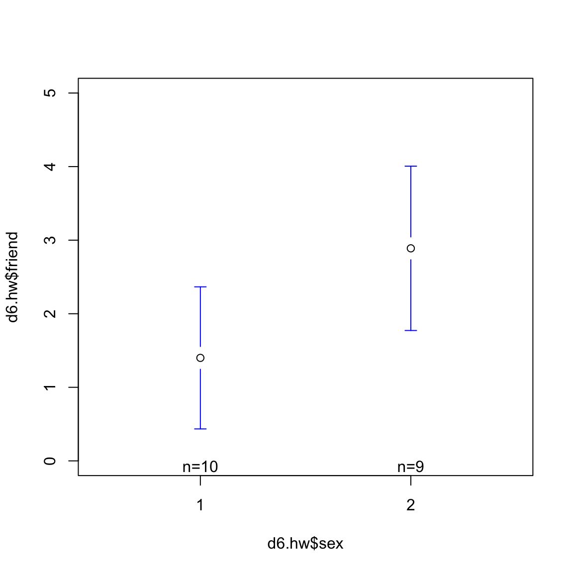 plotmeans(d6.hw$friend ~ d6.hw$sex, ylim=c(0,5), connect = F)