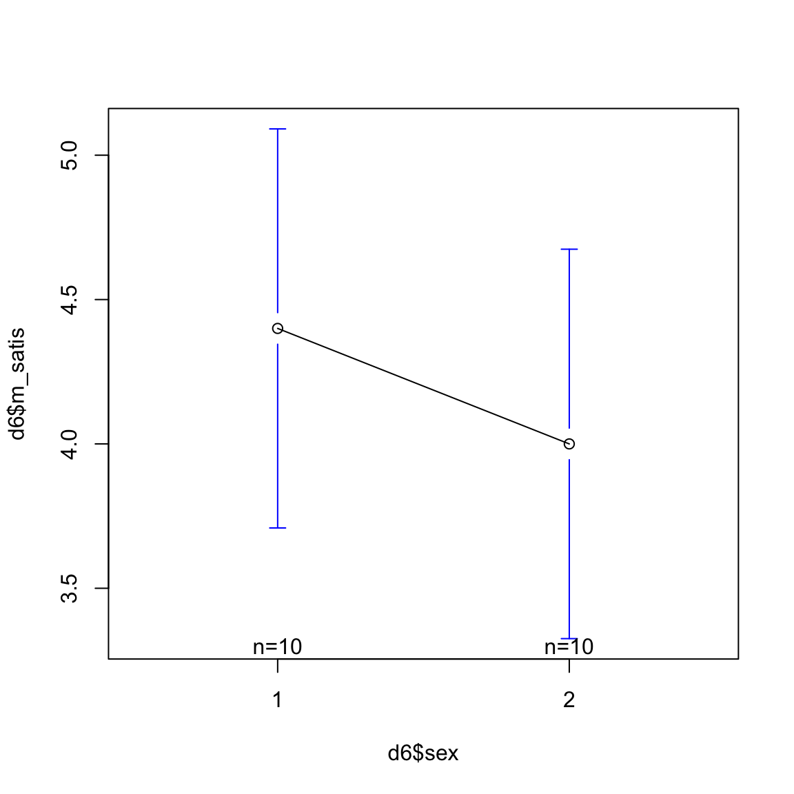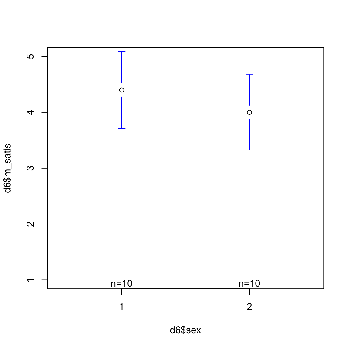 plotmeans(d6$m_satis ~ d6$sex, ylim=c(1,5), connect = F)
