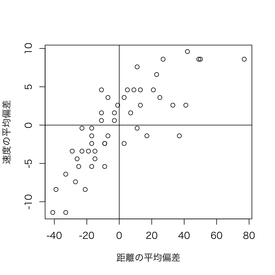 plot(mdist,mspeed,xlab="距離の平均偏差", ylab="速度の平均偏差")