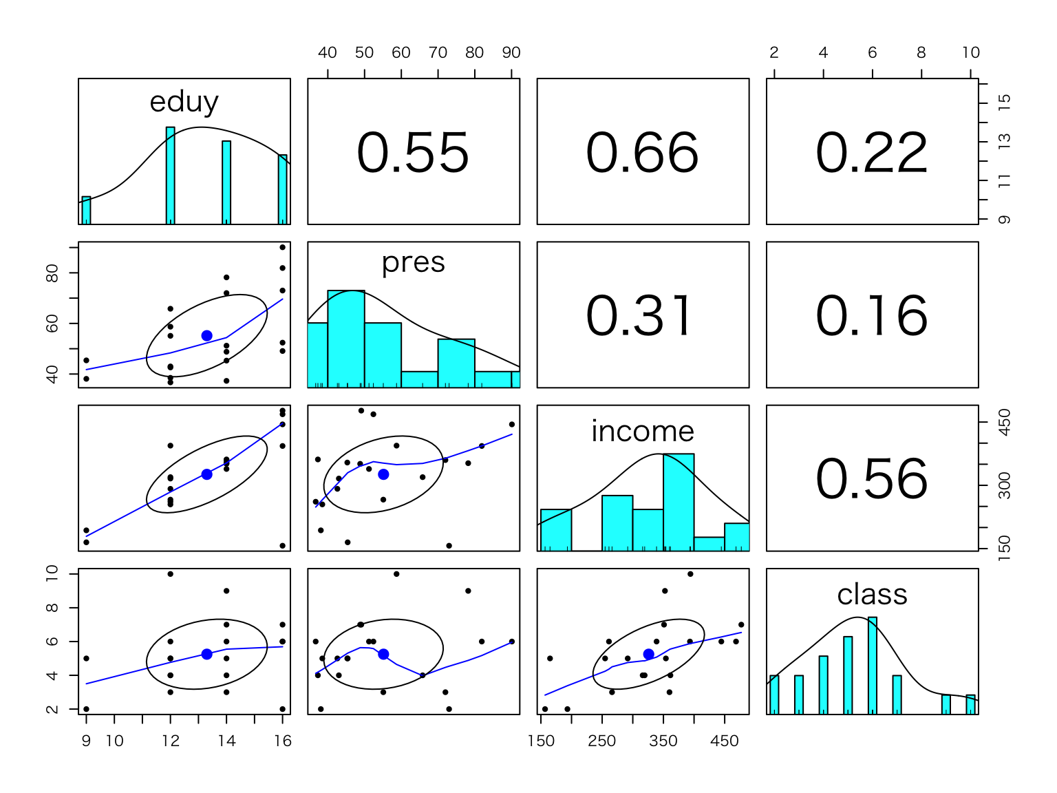 サンプルは女性から構成されており,eduyは教育年数,presは職業威信スコア,incomeは所得,classは階層帰属意識である。 階層帰属意識とは,自分がどこの階級に属するかを答えさせたものである。
