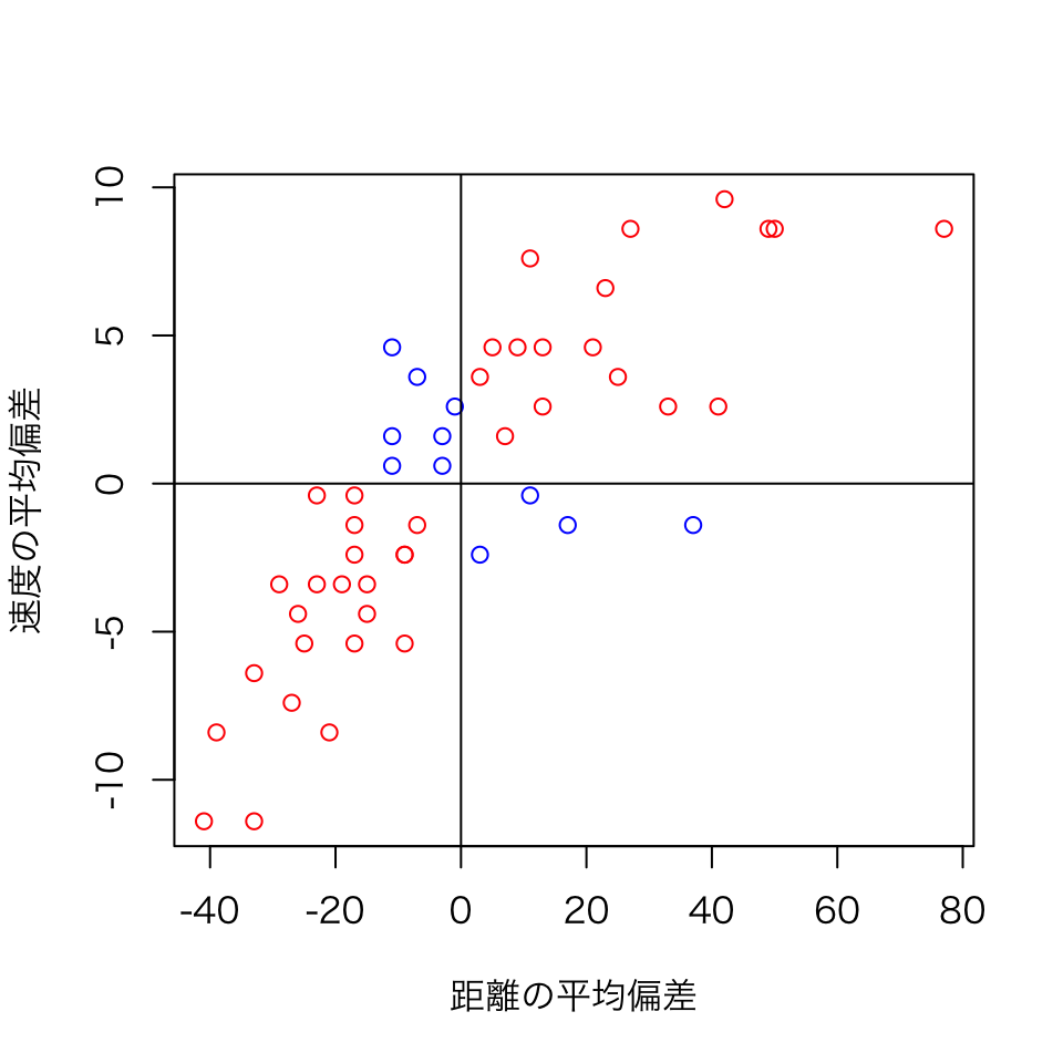 plot(mdist,mspeed,col=c("blue","red")[group],xlab="距離の平均偏差",ylab="速度の平均偏差")