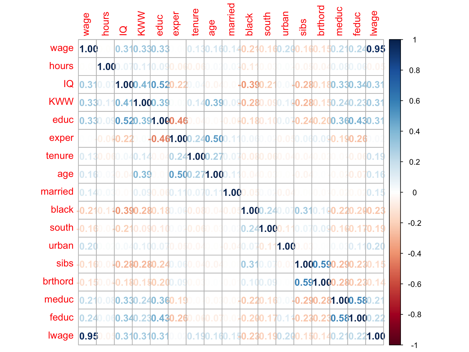 いきなり回帰分析をするのではなく、まずは変数間の関係を確認するために、wage2に収録されている変数間の相関係数行列を作成します。 基本関数cor()とcorrplotパッケージのcorrplot()関数を用いて相関行列の表を作成します。
